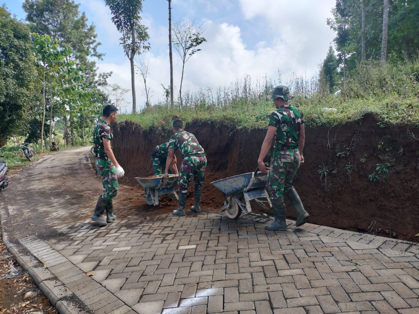 PENJURU.ID | Probolinggo – Satgas TMMD Ke-121 Kodim 0820/Probolinggo bersama masyarakat melaksanakan kegiatan merapikan atau membersihkan sisi kanan kiri jalan yang merupakan akses menuju Dusun Cocok, Desa Kalianan setelah sebelumya dilakukan pavingisasi.