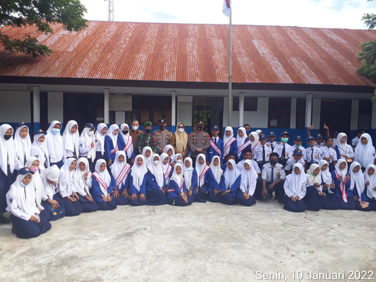 PENJURU. ID | Jeneponto – Bhabinkamtibmas Desa Sapanang Aiptu Akbar bersama Babinsa Serka Haruna dampingi Kapolsek Binamu Iptu Baharudin S.Sos dalam rangka kunjungan ke SMPN 4 Binamu, Senin (10/01/2022)