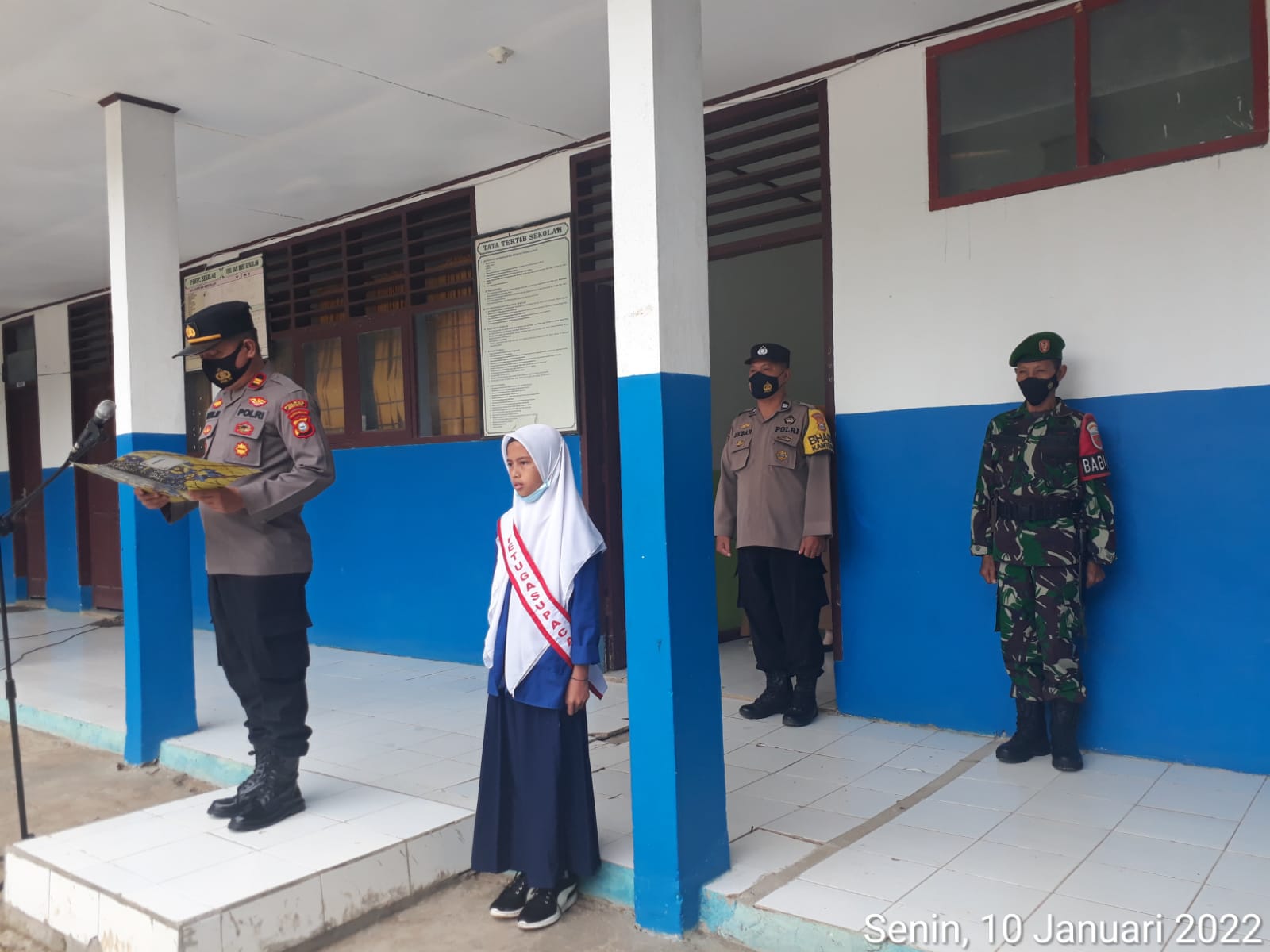 Bhabinkamtibmas Aiptu Akbar melaksanakan kegiatan rutin di setiap hari senin yakni sambang dan penyuluhan ke sekolah dalam bentuk menjadi pendamping inspektur upacara.