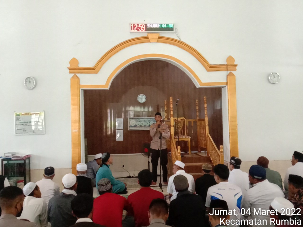 PENJURU. ID | Jeneponto – Bhabinkamtibmas Bripka Sufirman mendampingi Kapolsek Kelara Iptu Sukhardi,SH menghadiri safari jumat bersama masyarakat desa rumbia, Jum’at (04/03/2022)