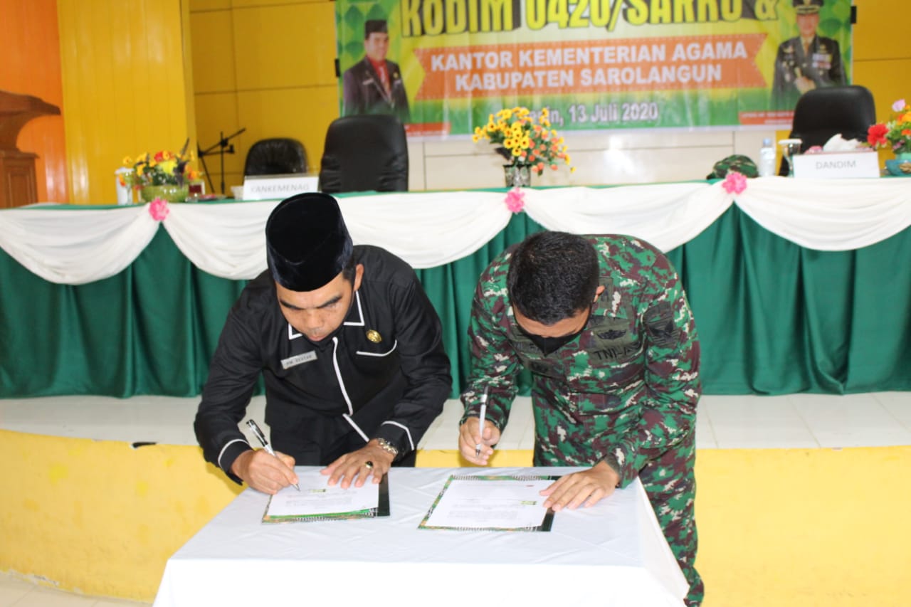 Tomi Radya Diansyah Lubis, S.A.P., M.Han dan Kepala Kemenag Kabupaten Sarolangun Drs.H.M. Syatar, tanda tangani perjanjian kerjasama di Kantor Kementerian Agama Kabupaten Sarolangun tepatnya Aula Kantor Kemenag Komplek Perkantoran Gunung Kembang Sarolangun Jambi, Senin (13/7/2020).