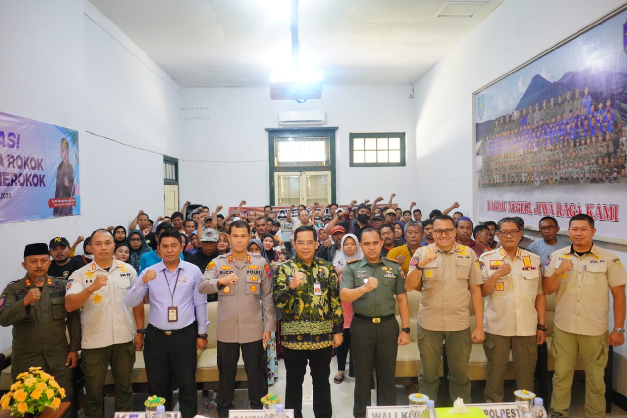 PENJURU.ID | Probolinggo – Kodim 0820/Probolinggo Letkol Arh Iwan Hermaya bersama jajaran forum kordinasi pimpinan daerah Kota Probolinggo menghadiri kegiatan sosialisasi kawasan tanpa rokok dan kawasan terbatas merokok diikuti puluhan peserta di ruang pertemuan Kantor Satpol PP Kota Probolinggo, Jumat (1/8).