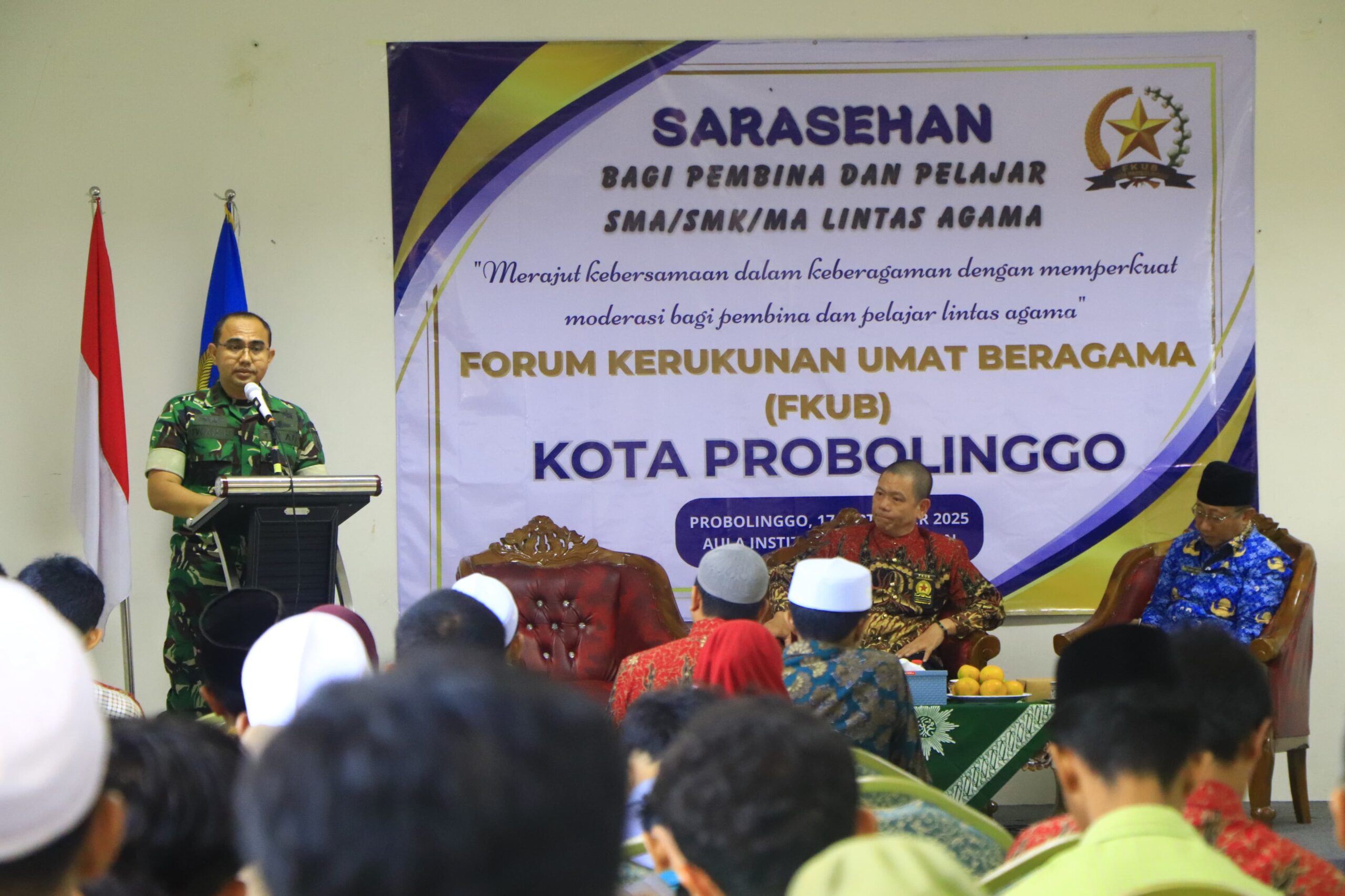 PENJURU.ID | Probolinggo – Komandan Kodim (Dandim) 0820/Probolinggo Letkol Arh Iwan Hermaya ikut ambil bagian dalam kegiatan sarasehan bagi pembina dan pelajar SMA/SMK/MA lintas agama yang di fasilitasi oleh forum kerukunan umat beragama (FKUB) Kota Probolinggo.