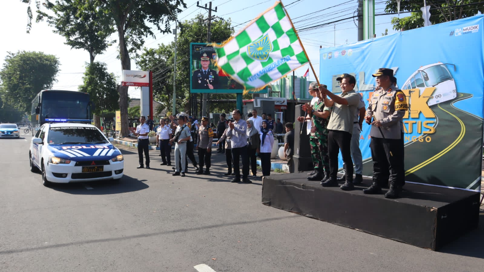 PENJURU.ID | Probolinggo – Komandan Kodim (Dandim) 0820/Probolinggo Letkol Arm Heri Budiasto bersama jajaran forum kordinasi pimpinan daerah (Forkopimda) Kota Probolinggo melepas program balik mudik gratis di depan Kantor Wali Kota Probolinggo, Selasa (16/4).