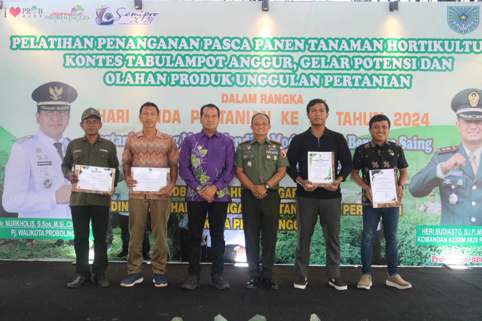 PENNURU.ID | Probolinggo – Komandan Kodim ( Dandim) 0820/Probolinggo Letkol Arm Heri Budiasto secara resmi menutup gelaran pelatihan penanganan pasca panen penanaman hortikultura, kontes tabulampot anggur serta gelar potensi dan olahan produk unggulan pertanian dalam rangka hari Krida Pertanian ke 52 tahun 2024 di halaman Makodim setempat, Jumat (5/7).