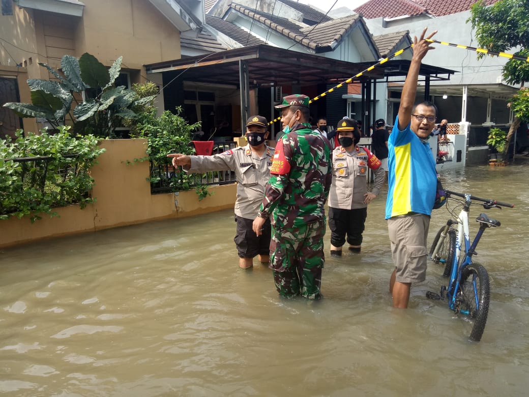 PENJURU.ID| TANGSEL – Kodam Jaya, Tangerang – Danramil 05 Ciputat Kapten Arh Samsuri mendampingi Wali Kota Tangsel Benyamin Davnie meninjau langsung genangan air di perumahan Nerada Estate Cipayung RT 01/10 Cipayung, kecamatan Ciputat kota Tangsel, Sabtu (12/06/2021).