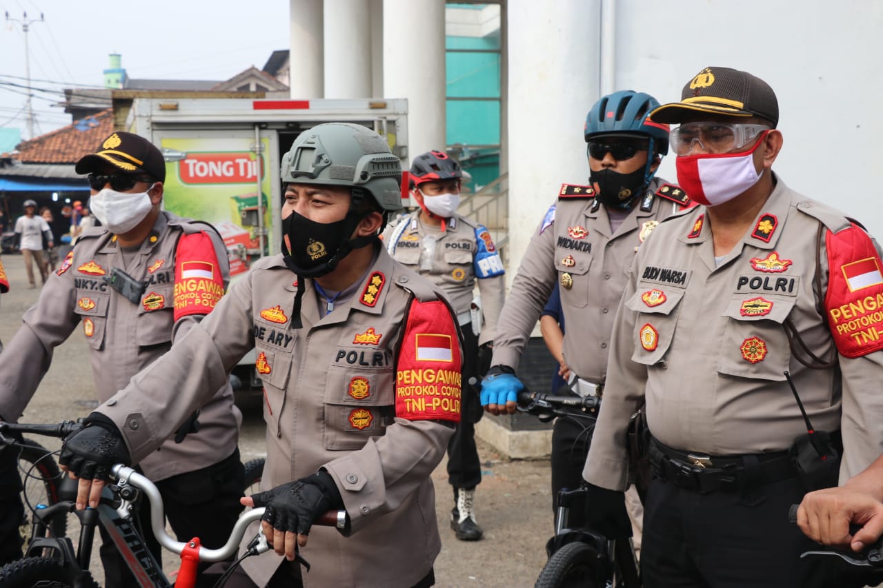 PENJURU.ID-Tangerang. Kapolresta Tangerang Kombes Pol. Ade Ary Syam Indradi menggelar patroli sepeda dengan rute mulai dari Kecamatan Panongan hingga Kecamatan Balaraja, Kamis (9/7/2020). Dalam perjalanan, Ade memberikan edukasi kepada warga agar menerapkan protokol kesehatan.