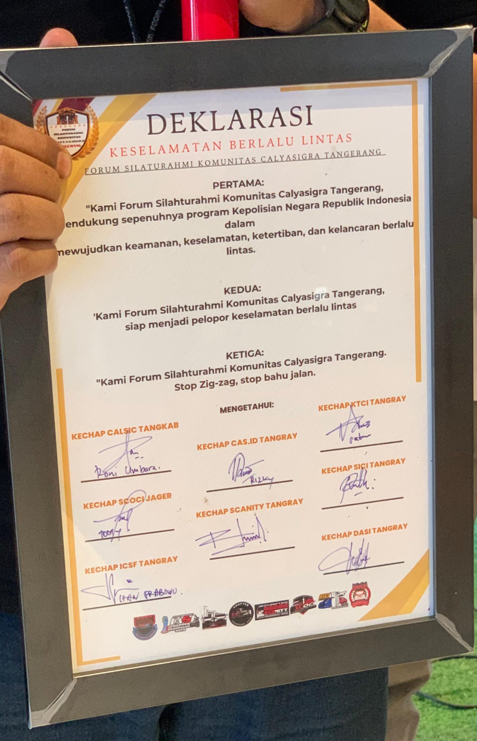 Pembacaan deklarasi keselamatan berlalu lintas di pimpin oleh om Riio dari CALSIC Tangerang_Kabupaten, sebagai Koordinator Wilayah Forum Silaturahmi Komunitas Calya Sigra Tangerang (FSKC) Tangerang dan diikuti seluruh member yang hadir dari 8 Komunitas/Club yang tergabung, serta di tanda tangani oleh masing-masing Ketua Chapter CALSIC TANGKAB, SCOCI JAGER, DASI TANGRAY, KTCI TANGRAY, ICSF TANGRAY, CAS.ID TANGRAY, SICI TANGRAY, DAN SCANITY TANGRAY.