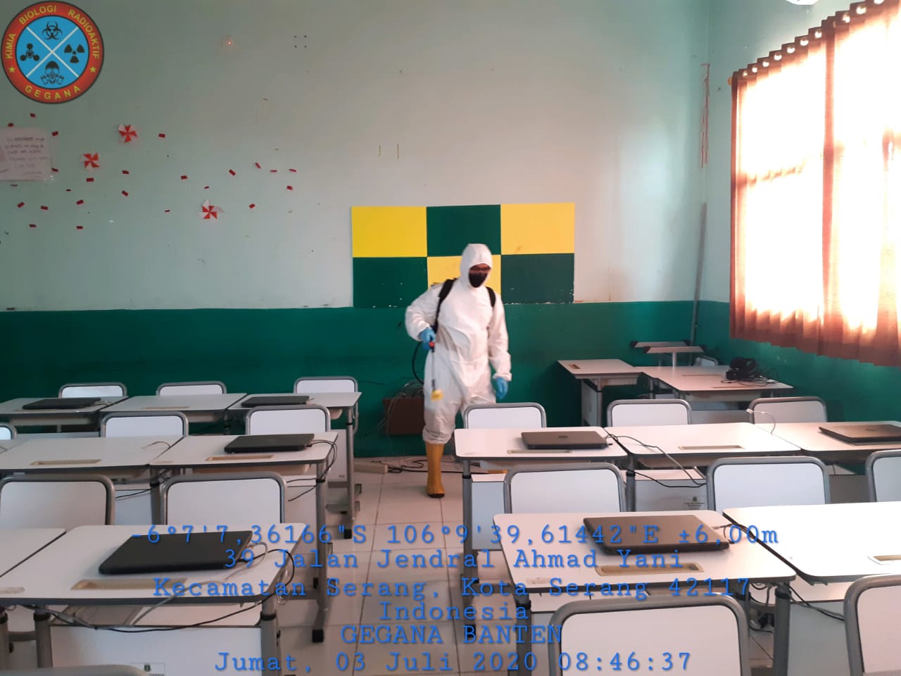 “Kegiatan penyemprotan disinfektan dilakukan pada sudut-sudut tanpa terkecuali seperti gagang pintu, pagar, halaman sekolah serta lingkungan sekitar sekolah dan benda-benda yang sering terkena sentuhan tangan juga turut diberikan penyemprotan disinfektan agar meminimalisir bermukimnya bakteri atau virus corona disease 2019 (Covid-19),” ucap Dwi Yanto Nugroho.