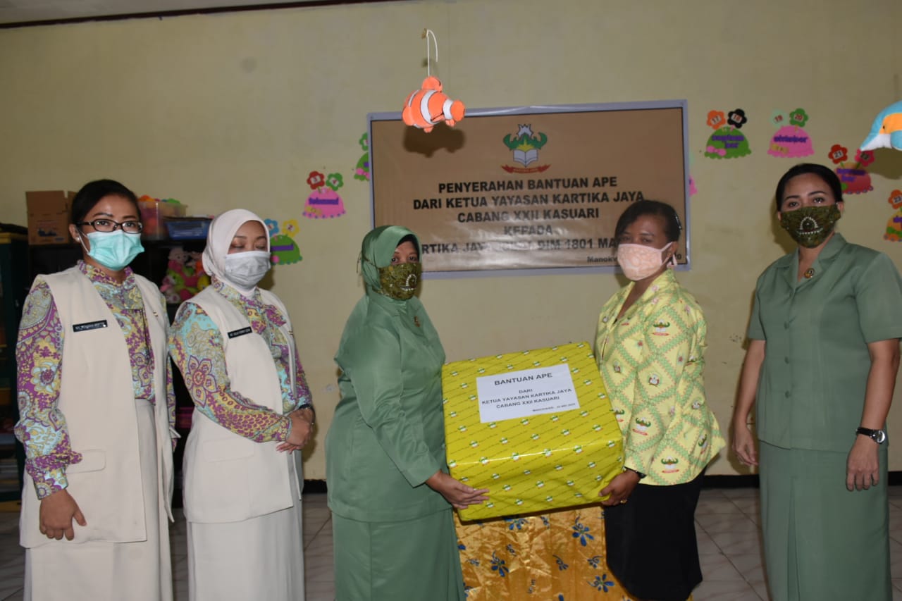 Selanjutnya, ibu-ibu Dharma Pertiwi mengunjungi Taman Kanak-Kanak (TK) Kartika Jaya Kodim 1801/Manokwari untuk menyerahkan bantuan Alat Permainan Edukatif (APE) kepada Yayasan TK Kartika Jaya XXII-I Kodim 1801/Manokwari.
