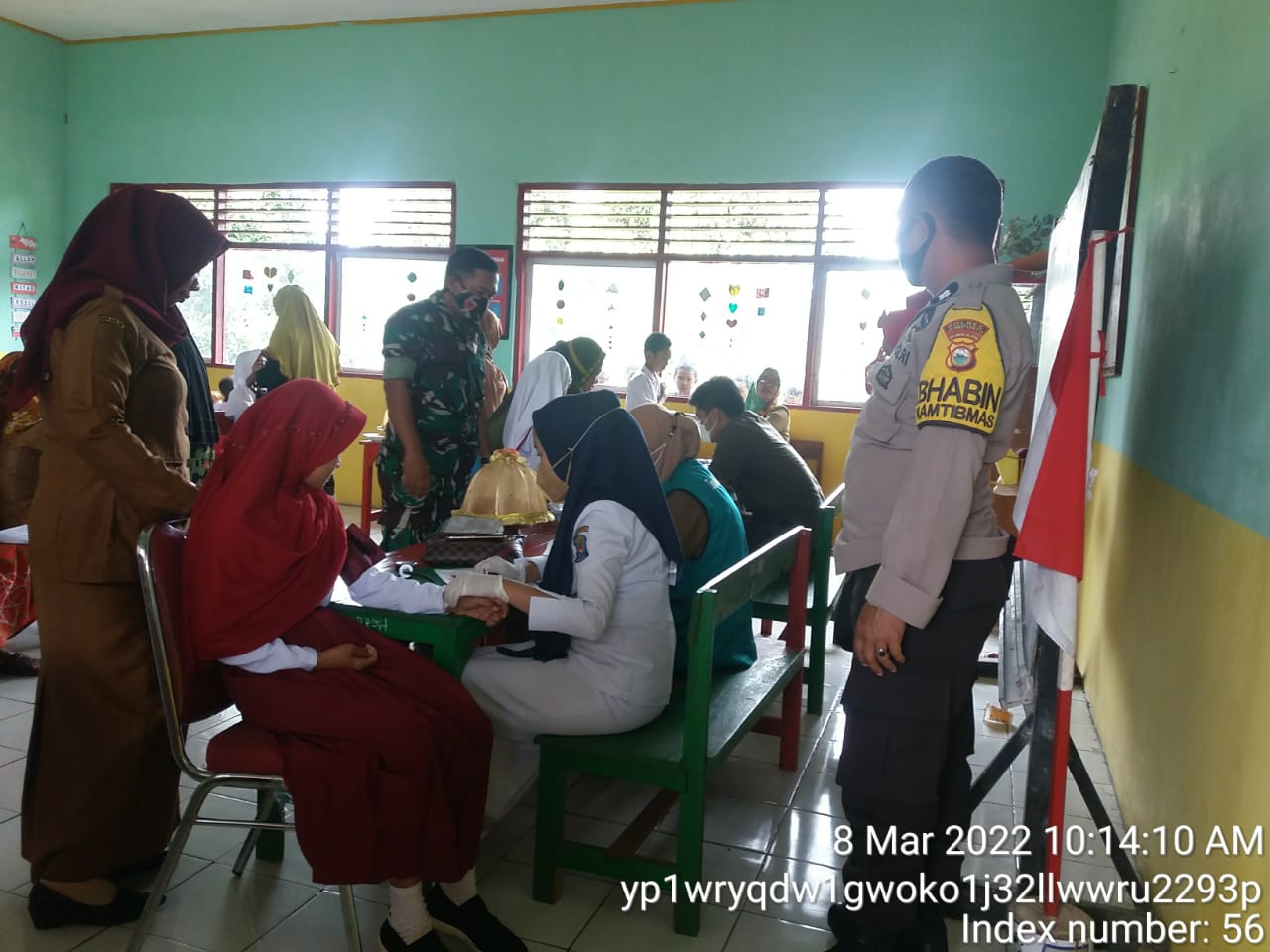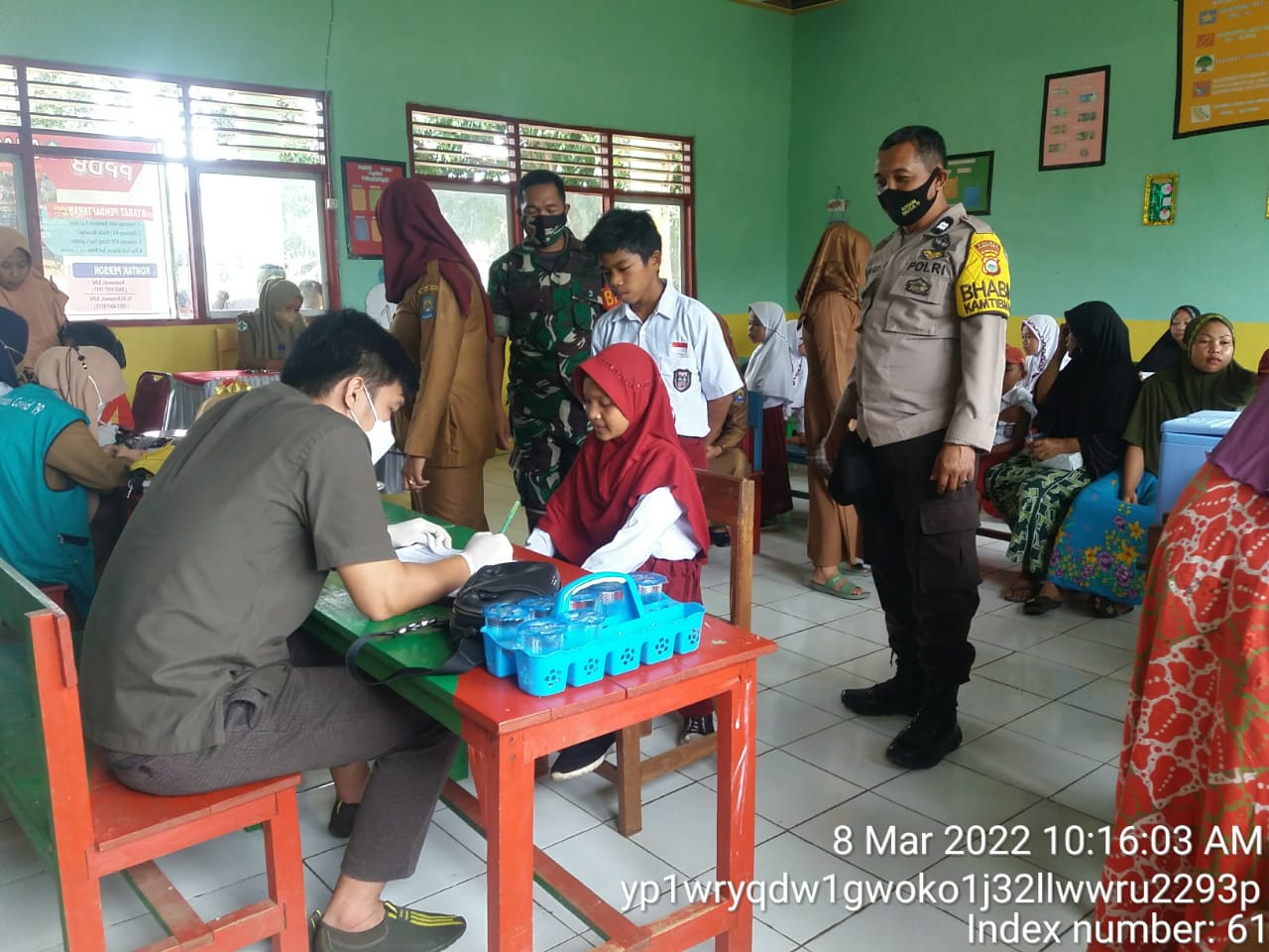 PENJURU. ID | Jeneponto – Bhabinkamtibmas tolo timur dan tolo utara Aiptu Palinggi bersama Babinsa Serda Basri melaksanakan pendampingan pada kegiatan vaksinasi di SDI 240 Karampuang Kelurahan Tolo Timur Kecamatan Kelara, Selasa (8/3/2022)