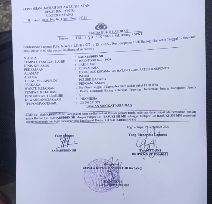 Sahabuddin, SH resmi melaporkan Camat Batang Basuki, SH. MH lantaran dirinya merasa di ancam saat menjalankan tugas sebagai kuasa hukum dalam perkara kasus sengketa tanah yang terletak di Kelurahan Togo-Togo, Kecamatan Batang, Kabupaten Jeneponto.