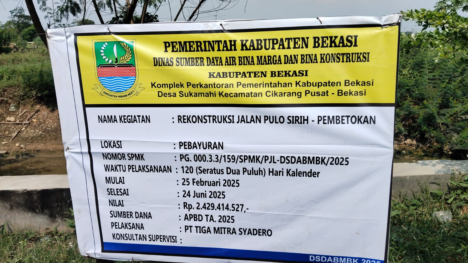 PENJURU.ID I Kabupaten Bekasi -Proyek rekonstruksi jalan di Pembetokan Pulo sirih, Desa Sukajadi, Kecamatan Sukakarya, Kabupaten Bekasi yang dikerjakan oleh Kontraktor PT. Tiga Mitra Syadero dikeluhkan warga. Pasalnya, proyek dari DSDABMBK yang anggarannya mencapai Rp, 2.429. 414.527 bersumber dari APBD TA 2025 diduga langgar aturan kerja tidak sesuai spesifikasi, Rencana Anggaran Biaya (RAB).