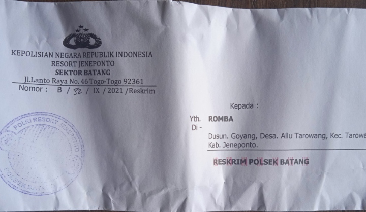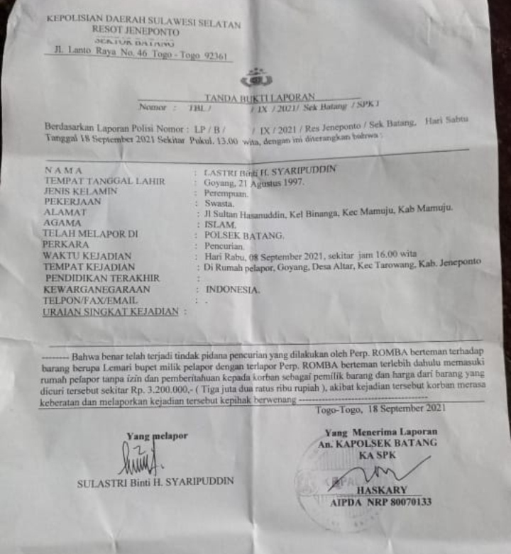 Hal ini diterangkan Perp. Lastri Binti H. Syarifuddin (24) tak lain adalah anak bungsu korban Perp.Hj Saniar dengan Berdasarkan Laporan Polisi Nomor: LP/B/ 58 /1X/2021/Res Jeneponto/Sek Batang, pada Sabtu 18 September 2021 Sekitar Pukul 13.00 Wita.