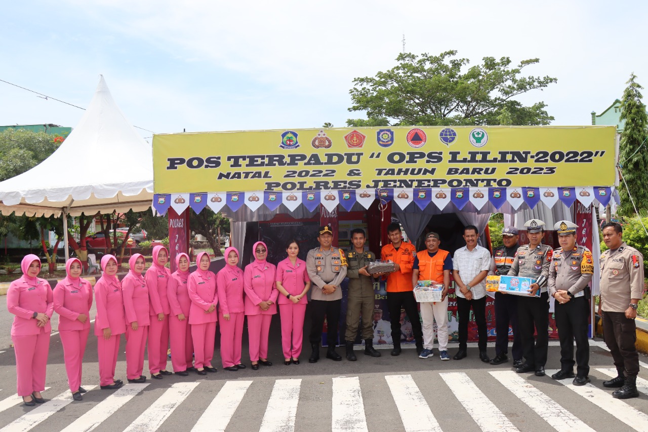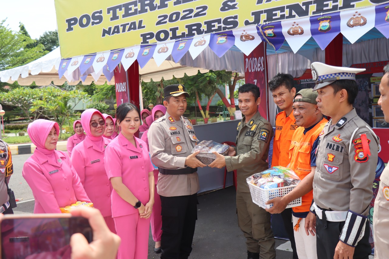 PENJURU. ID | Jeneponto – Kapolres Jeneponto AKBP Andi Erma Suryono, SH.,SIK bersama Ketua Bhayangkari Cabang Jeneponto Ny, Elli Andi Erma serahkan bingkisan kepada para petugas Posko Lilin 2022.