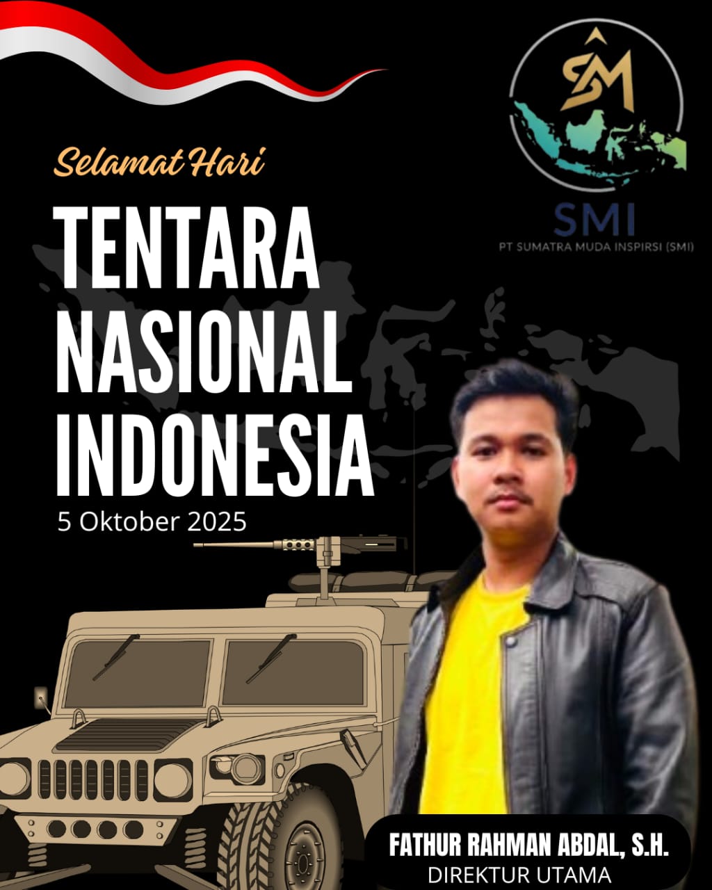 Penjuru.id | Jakarta — Dalam rangka memperingati Hari Ulang Tahun Tentara Nasional Indonesia (TNI) ke-79, Direktur Utama PT Sumatra Muda Inspirasi, Fathur Rahman Abdal, S.H., menyampaikan ucapan selamat dan apresiasi mendalam atas dedikasi, loyalitas, dan pengabdian TNI dalam menjaga kedaulatan serta keutuhan Negara Kesatuan Republik Indonesia (NKRI).