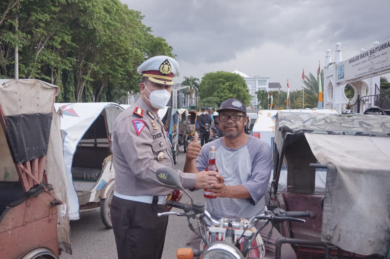 PENJURU.ID | Banda Aceh – Ratusan tukang becak yang mangkal di sekitar Masjid Raya Baiturrahman, Banda Aceh, mendapat sirup yang dibagi Dirlantas Polda Aceh Kombes Pol. Dicky Sondani, S. I. K., M. Si, bersama sejumlah personel jajarannya termasuk Satlantas Polresta Banda Aceh, Jum’at (8/4/22) kemarin.