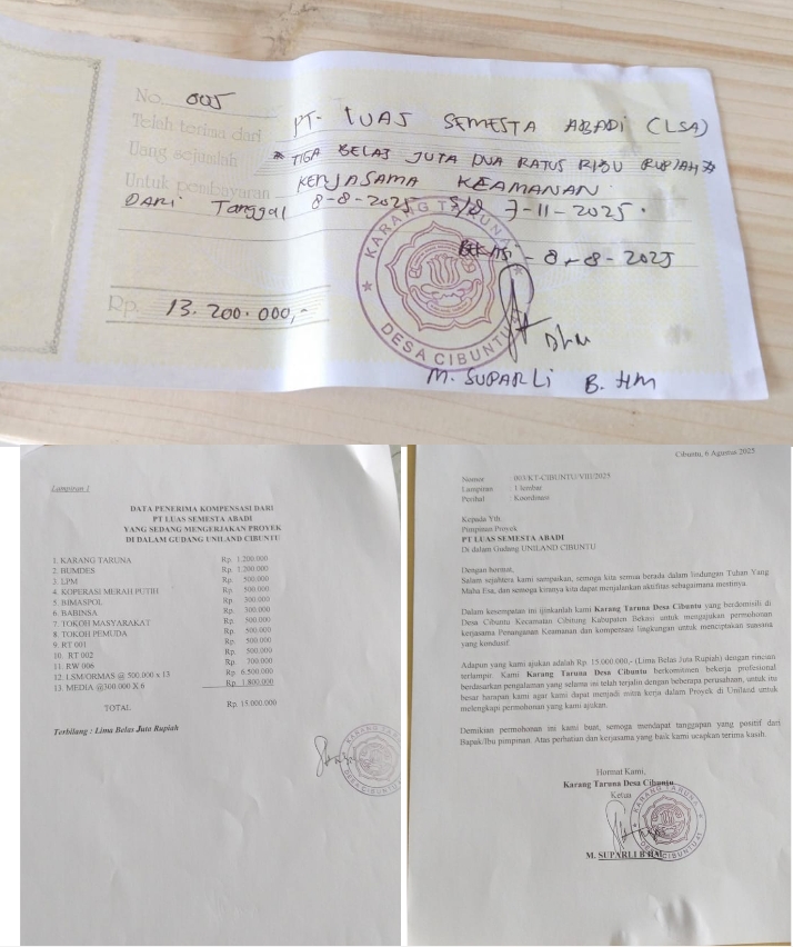 Penjuru.id ] Kabupaten Bekasi, 16 Oktober 2025— Kasus dugaan pungutan liar (pungli) yang menyeret nama oknum Karang Taruna Desa Cibuntu, Kecamatan Cibitung, Kabupaten Bekasi, semakin menjadi sorotan publik. Hal itu mencuat setelah beredarnya dokumen surat dan kwitansi bertanda tangan yang mencantumkan penerimaan uang sebesar Rp13.200.000 dari pihak PT Luas Semesta Abadi, perusahaan yang tengah mengerjakan proyek di area Gudang Uniland, Cibuntu.