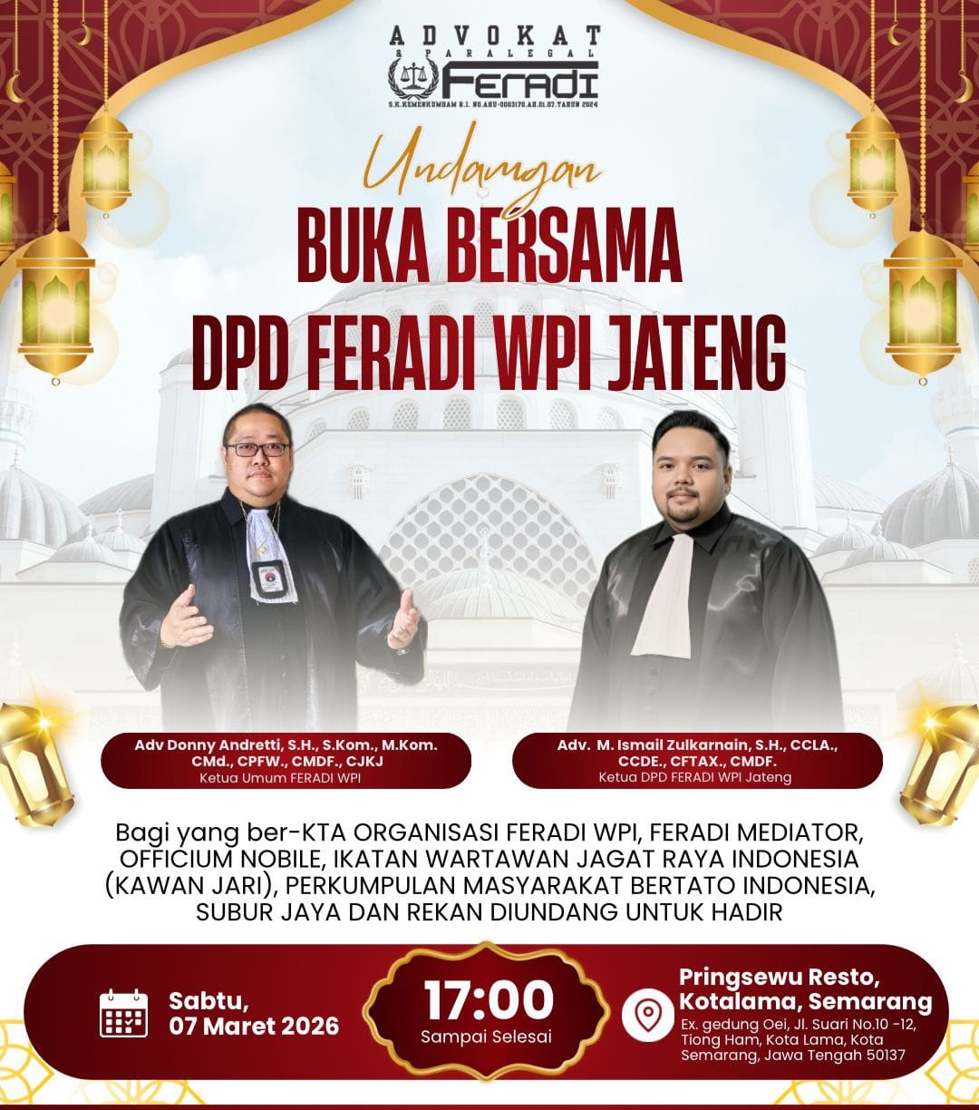 Pekalongan, 20 Februari 2026 ditemui awak media, Ketua DPD FERADI WPI JAWA TENGAH – Advokat Muhammad Ismail Zulkarnain, S.H., CLC., CCLA., CCDE., CFTAX., C.PFW., C.MDF., C.JKJ., CPL, Menyampaikan bahwa DPD FERADI WPI Jawa Tengah akan mengadakan Agenda buka puasa bersama di Hari Sabtu 7 Maret 2026. Mulai pk.17.00 wib – Selesai. Bertempat di Resto Pringsewu Kotalama, Jalan Suari Nomor 10-12, Seamarang, Jawa Tengah. Semoga acara ini bisa mempererat tali persaudaraan antar sesama anggota dan pengurus FERADI WPI Jateng dan seluruh Indonesia.