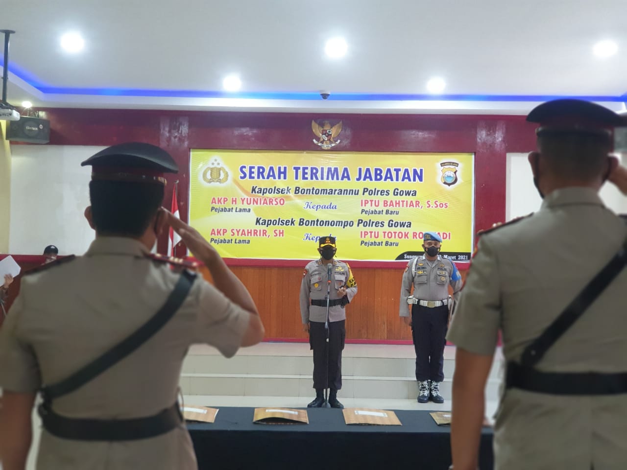 Dua pejabat baru di lingkup Polres Gowa yang diserahterimakan diantaranya Kapolsek Bontomarannu yang selama ini dijabat AKP. H. Yuniarso diserahterimakan kepada IPTU Bachtiar S.Sos sementara Kapolsek Bontonompo diserahterimakan dari AKP Syahrir kepada IPTU Totok Rohyadi.
