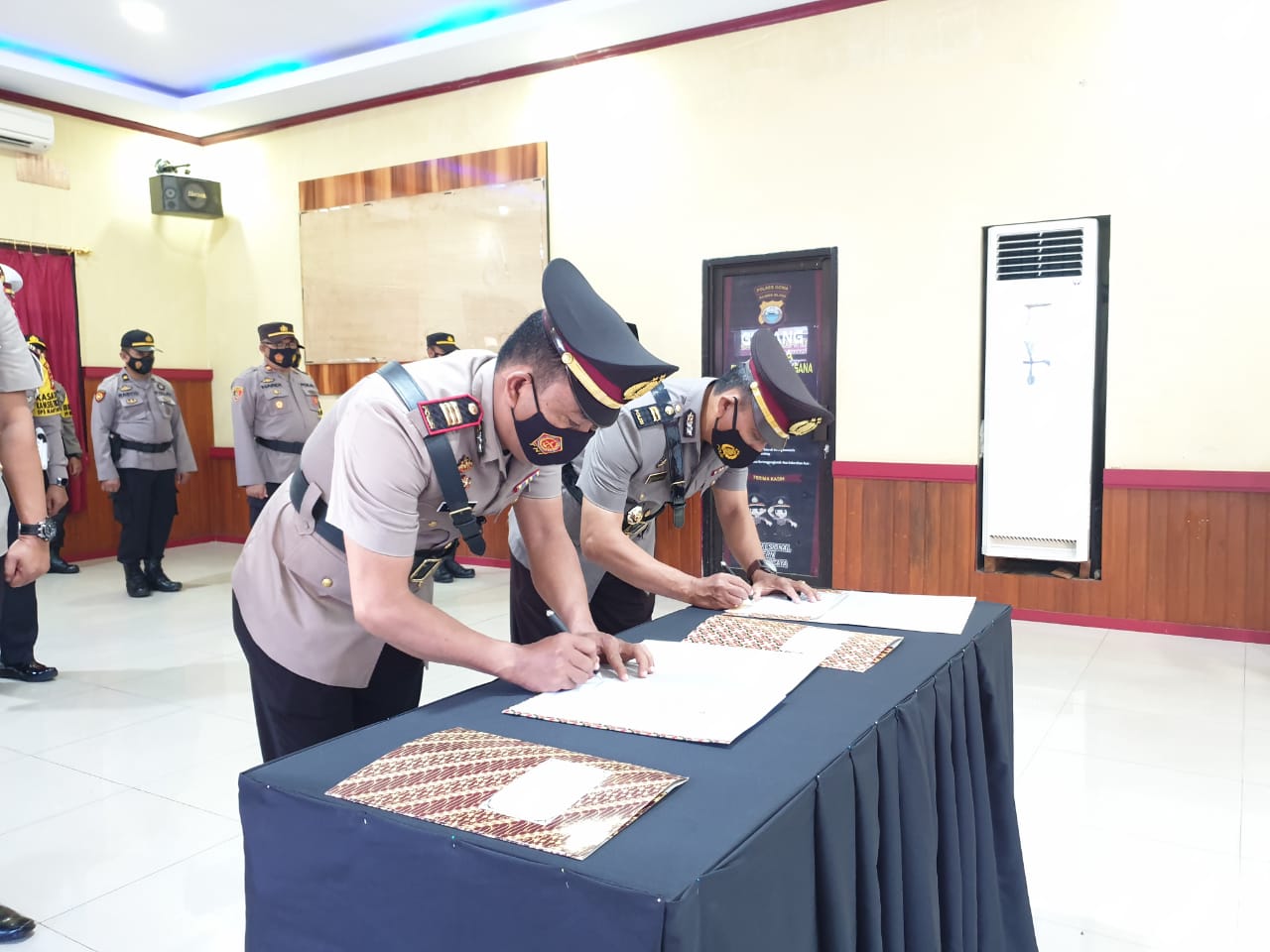 Kegiatan serah terima jabatan yang digelar pagi tadi dilakukan sesuai sengan protokol kesehatan guna mengantisipasi penyebaran Covid-19 di lingkungan Polres Gowa.