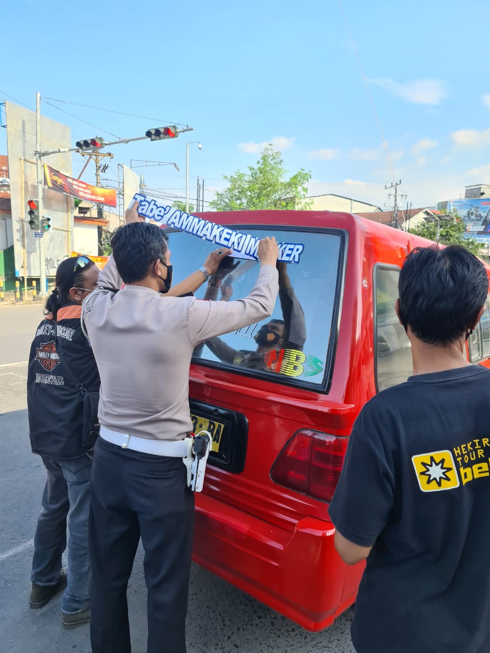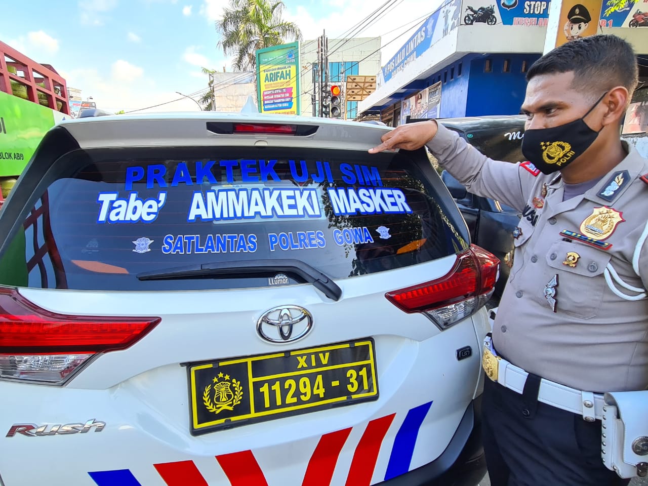 Tampak dalam pantauan Awak media Penjuru.id, pemasangan stiker dengan tulisan “TABE’ AMMAKEKI MASKER” pada kendaraan dinas R4 Patroli, R4 pengawalan, R4 dikyasa dan R4 TP-TKP serta pada kendaraan praktek uji SIM Lantas Polres Gowa dan pada setiap kendaraan R4 yang melintas di jalan poros Malino juga akan dipasangkan stiker.