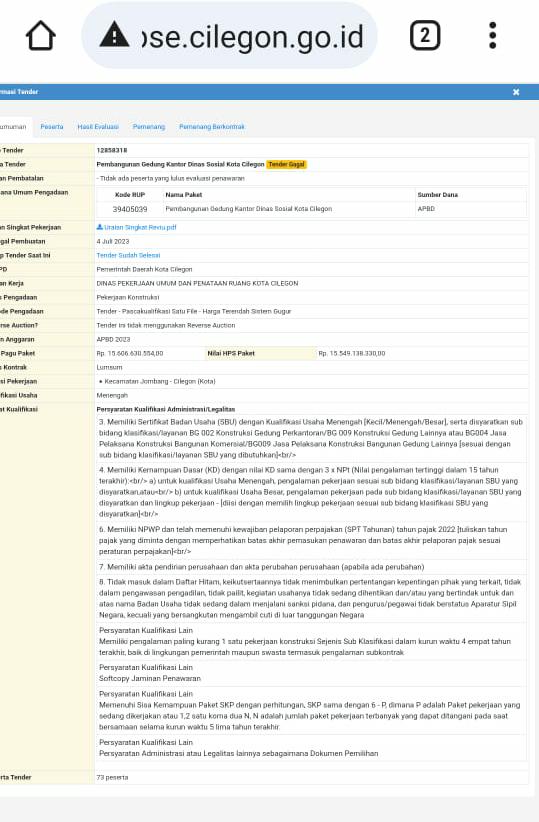 Penjuru.id. Cilegon. Pemerintah kota (Pemkot) kota Cilegon melalui dinas Pekerjaan Umum dan Tata Ruang telah melaksanakan tender gedung Dinas Sosial (Dinsos) dengan nilai kisaran 15 milyar rupiah melalui bagian pengadaan barang dan jasa (Barjas) pemerintah kota Cilegon.