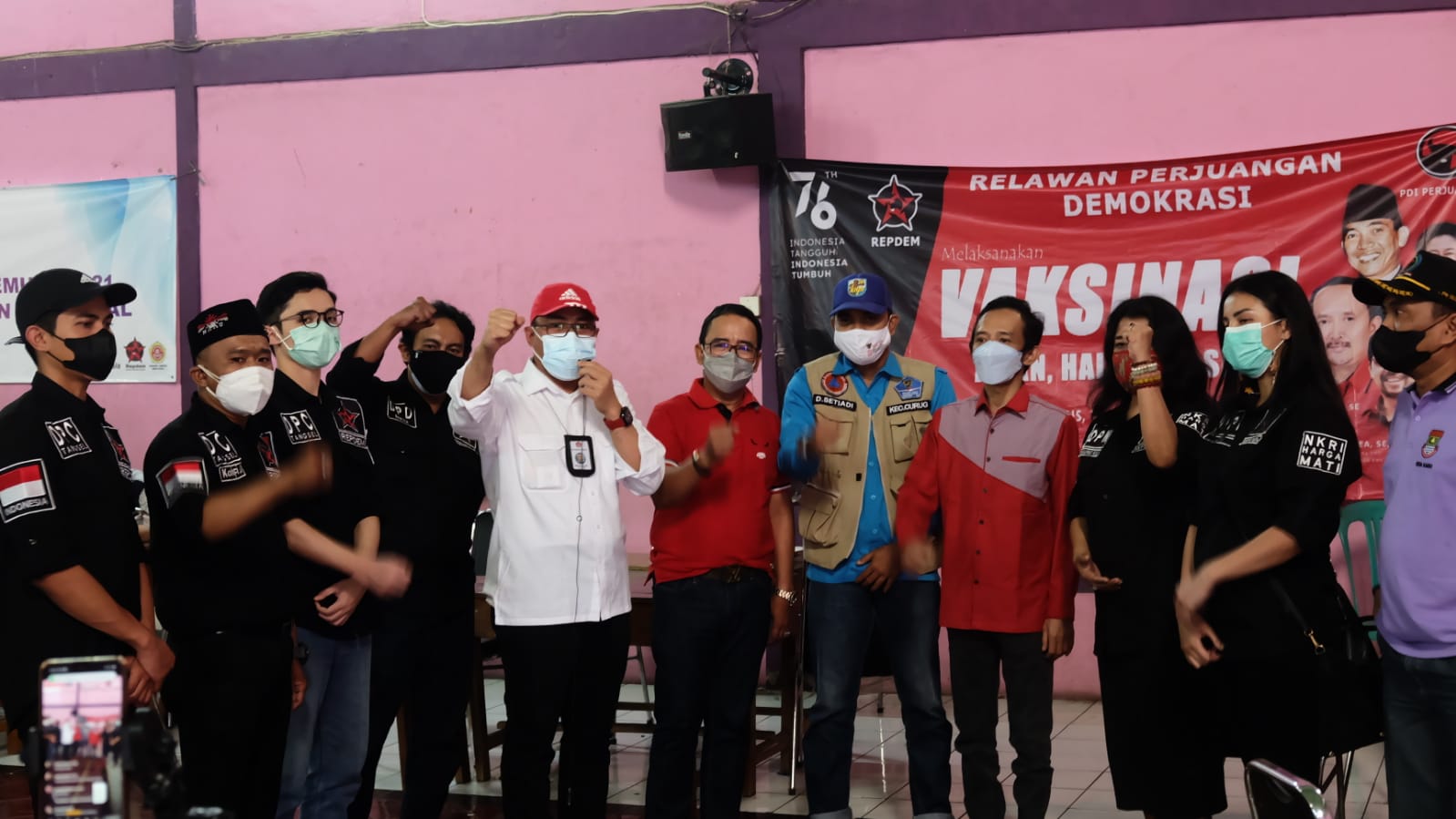 PENJURU.ID|Tangerang – Relawan Perjuangan Demokrasi (REPDEM) Propinsi Banten, Sayap Aktivis Pro Demokrasi PDI Perjuangan menggelar vaksinasi bagi warga masyarakat di Desa Kadu, Kecamatan Curug, Kabupaten Tangerang, Banten, Kamis 12/8/2021.