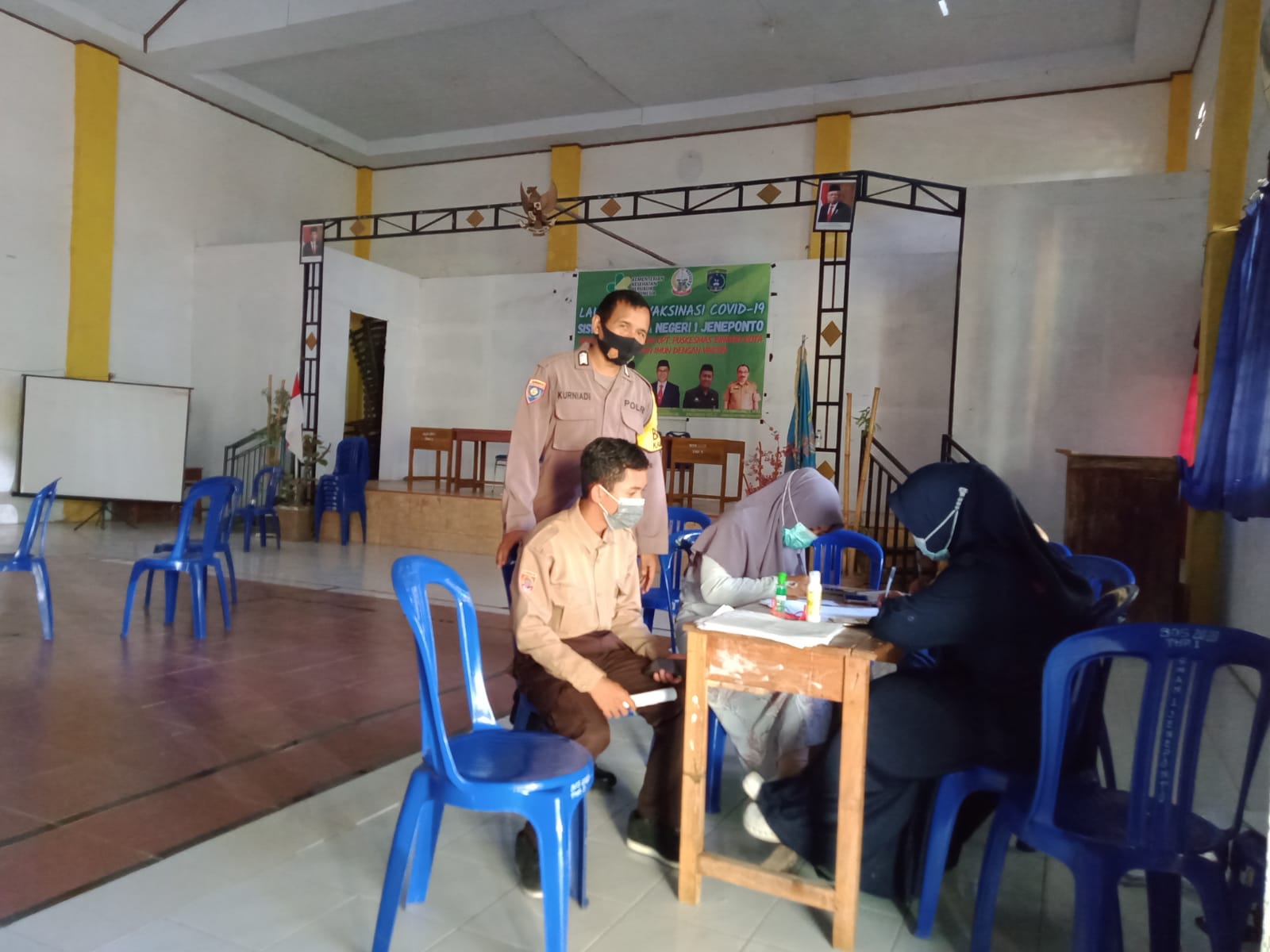 PENJURU. ID | Jeneponto – Sasaran Vaksinasi Massal di semua Sekolah SMA di Kabupaten Jeneponto, Bhabinkamtibmas Kelurahan Pabiringa, Kecamatan Binamu, Bripka Kurniadi kembali memantau pelaksanaan Vaksinasi Covid-19.