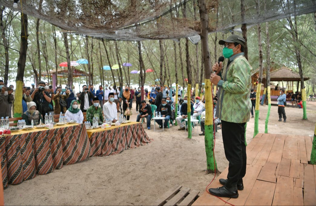 PENJURU.ID | Tuban – Menteri Desa, Pembangunan Daerah Tertinggal dan Transmigrasi Abdul Halim Iskandar bersama Nyai Lilik Umi Nasriyah menyambangi Pantai Semilir di Desa Socorejo Kecamatan Jenu, Kabupaten Tuban, Jawa Timur, Minggu (30/5/2021).