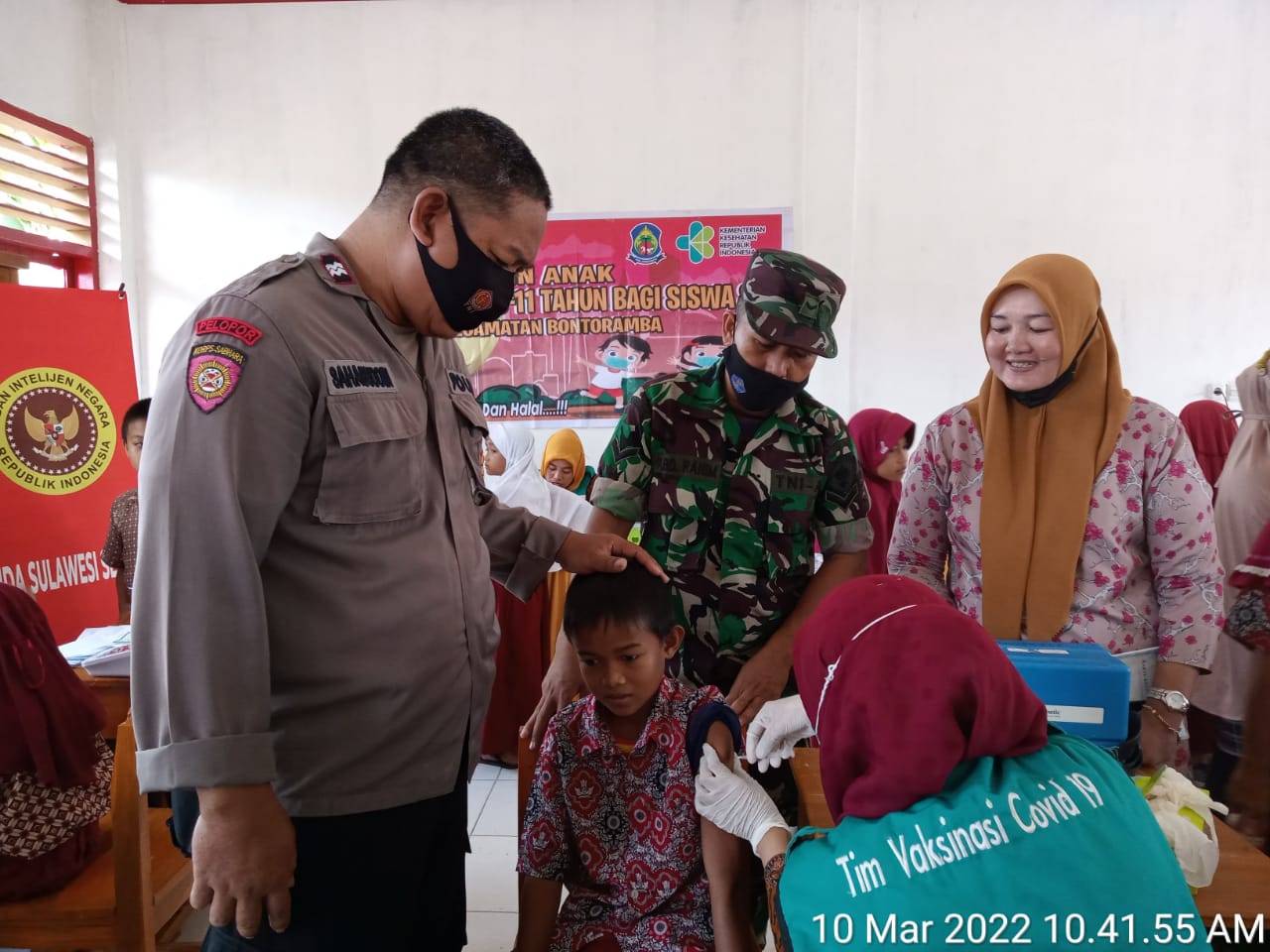 PENJURU. ID | Jeneponto – Kegiatan Vaksinasi di SD Negeri 3 Bontoramba Desa Bulusibatang Kecamatan Bontoramba di pantai Bhabinkamtibmas.