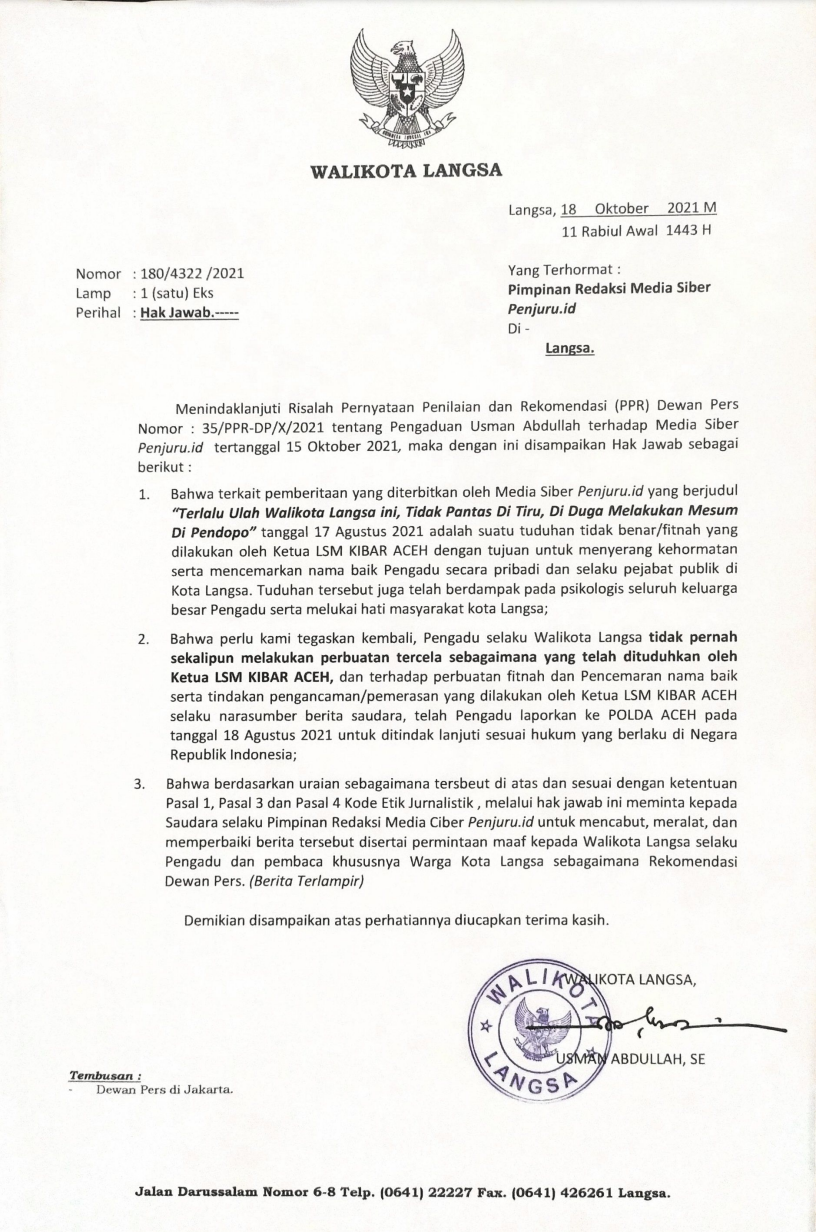 - Bahwa berdasarkan uraian sebagaimana tersebut di atas dan sesuai dengan ketentuan Pasal 1, Pasal 3 dan Pasal 4 Kode Etik Jurnalistik, melalui hak jawab ini meminta kepada Saudara selaku Pimpinan Redaksi Media Ciber Penjuru.id untuk mencabut, meralat, dan memperbaiki berita tersebut disertai permintaan maaf kepada Walikota Langsa selaku Pengadu dan pembaca khususnya Warga Kota Langsa sebagaimana Rekomendasi Dewan Pers. (Berita Terlampir)