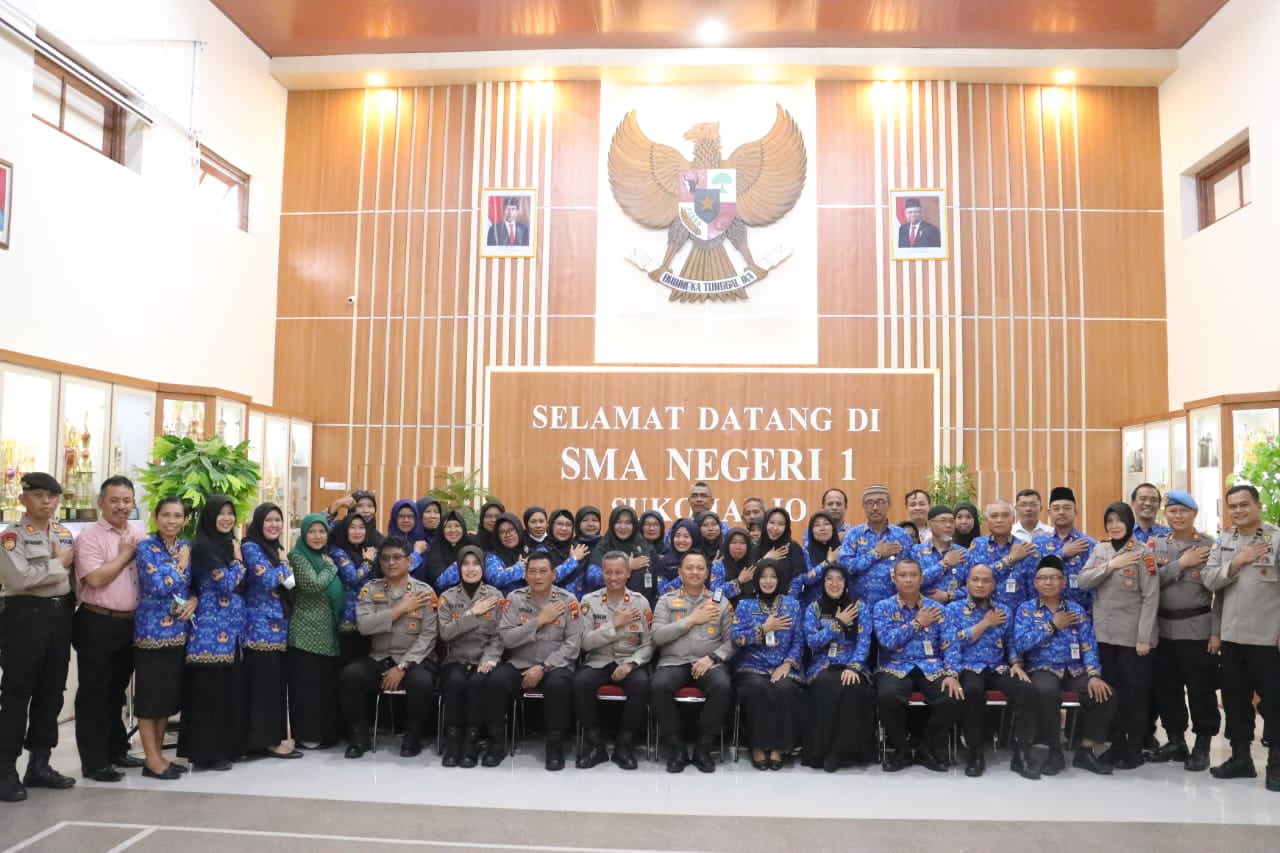 PENJURU.ID|Sukoharjo – Kapolres Sukoharjo AKBP Wahyu Nugroho Setyawan, didampingi Pejabat Utama (PJU) Polres, berkunjung ke SMA N 1 Sukoharjo, Kamis (24/11/2022). Kunjungan tersebut dalam rangka untuk memberikan ucapan selamat Hari Guru Nasional, yang jatuh pada 25 Nopember besok.