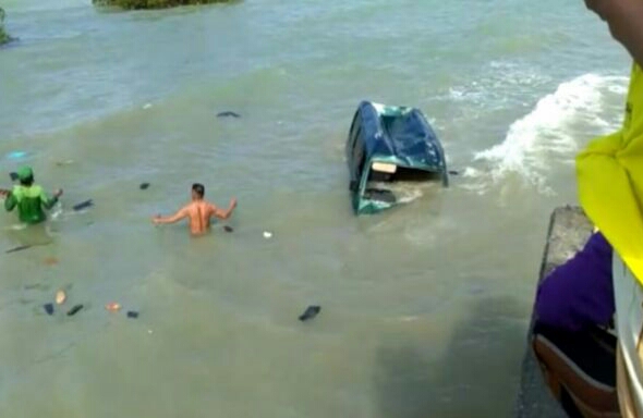 Akibat spontanitas untuk menghindari terjadinya adu badan dengan truk dari arah berlawan tersebut, pengemudi dari mini bus carry langsung banting setir sehingga mengakibatkan badan mobil jatuh ke laut.