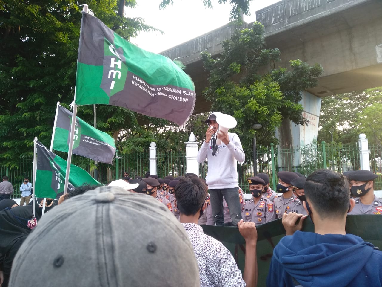 Tidak hanya itu Massa aksi Himpunan Mahasiswa Islam Cabang Jakarta mebawa sepanduk yang bertuliskan “Kami tidak butuh UU Omnibus Law, kami hanya butuh Turun“.