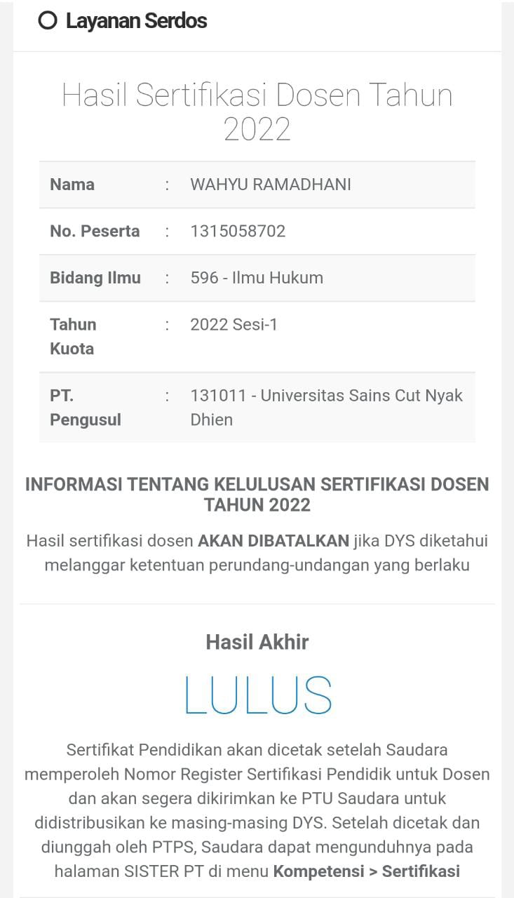 PENJURU.ID | Langsa – Wahyu Ramadhani,S.H.,M.H, Satu – satunya Dosen tetap Prodi Ilmu Hukum Universitas Sains Cut Nyak Dhien dinyatakan lulus dalam sertifikasi dosen (Serdos SMART) Kementerian Pendidikan dan Kebudayaan (KEMDIKBUD) Sesi-1 Tahun 2022.