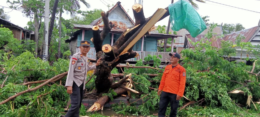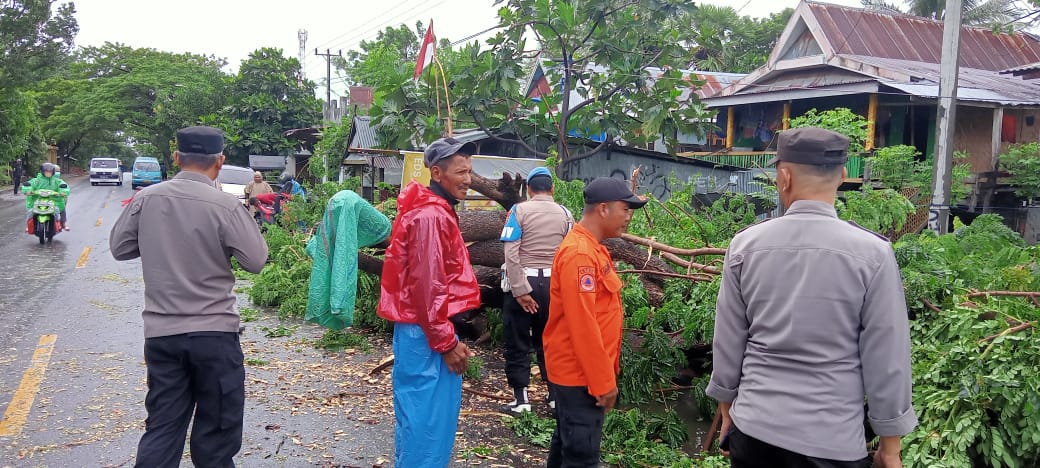 “Setiba dilokasi, kami bersama personil gabungan Pospam tarowang dibantu mobil deret melakukan upaya membuka jalan dengan mengangkut batang pohon yang tumbang tersebut. ” ujar Iptu Yasiruddin