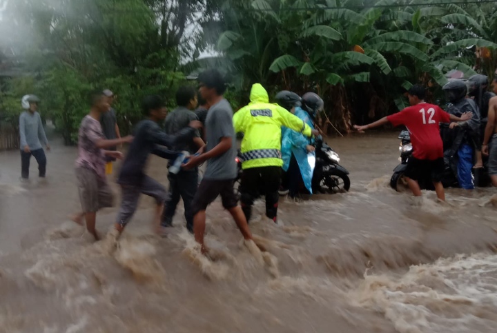 Genangan air yang begitu tinggi hingga para pengendara kesulitan melintas hingga warga setempat bersama para pengendara saling membantu melintasi genangan air tersebut.