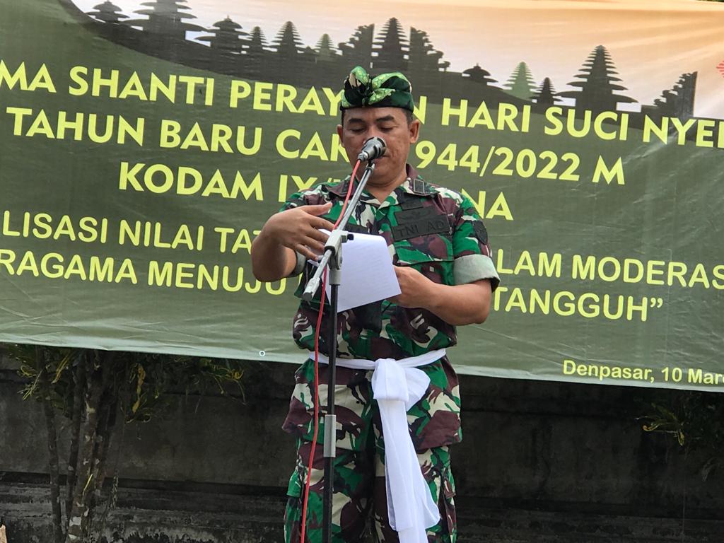 Terkait hal itu Umat Hindu Kodam IX/Udayana melaksanakan kegiatan Dharma Santi sebagai rangkaian Hari Raya Nyepi Tahun Baru Saka 1944, Kamis (10/03/2022) di Pura Praja Raksaka Kepaon Denpasar.