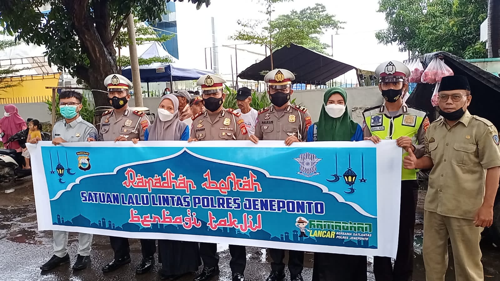 Dipimpin Kasat Lantas Polres Jeneponto AKP Syaharuddin,SH bersama jajarannya berbagai Ta’jil gratis untuk berbuka puasa kepada pengguna jalan seperti sopir, tukang ojek, tukang becak maupun masyarakat umum.