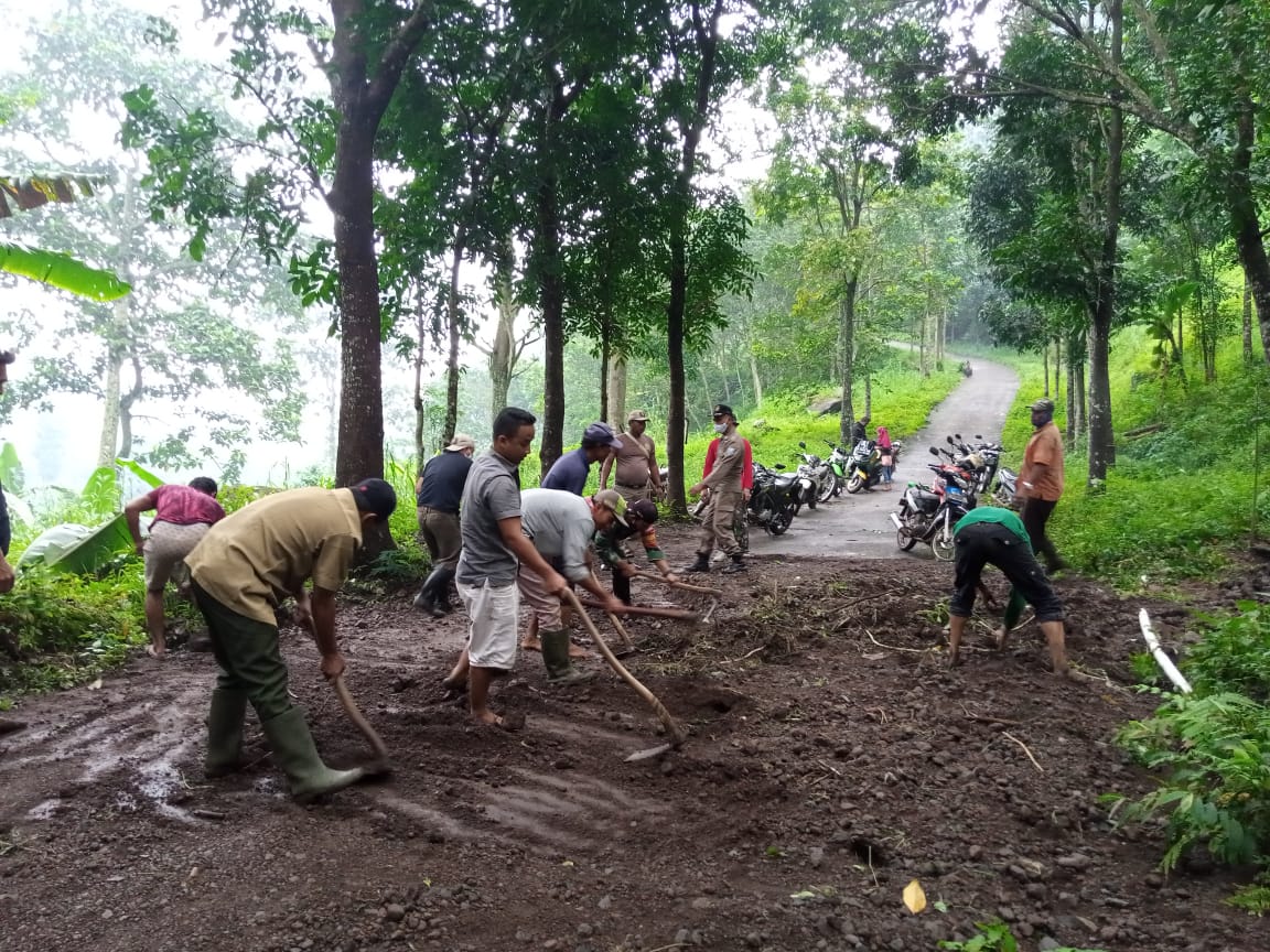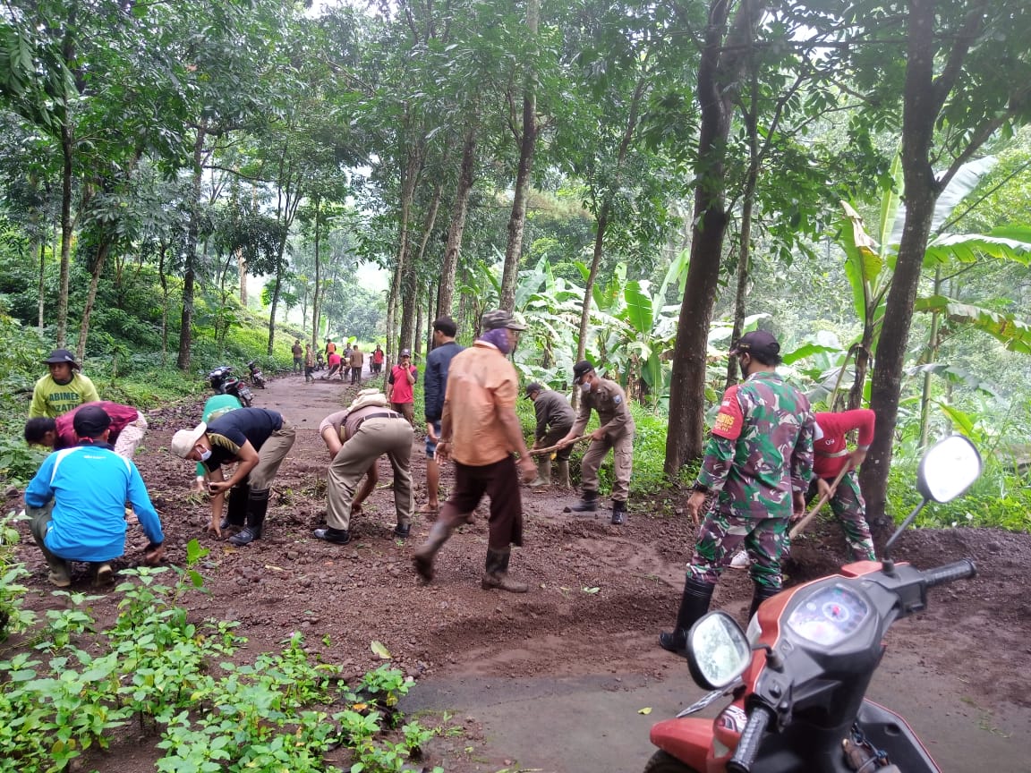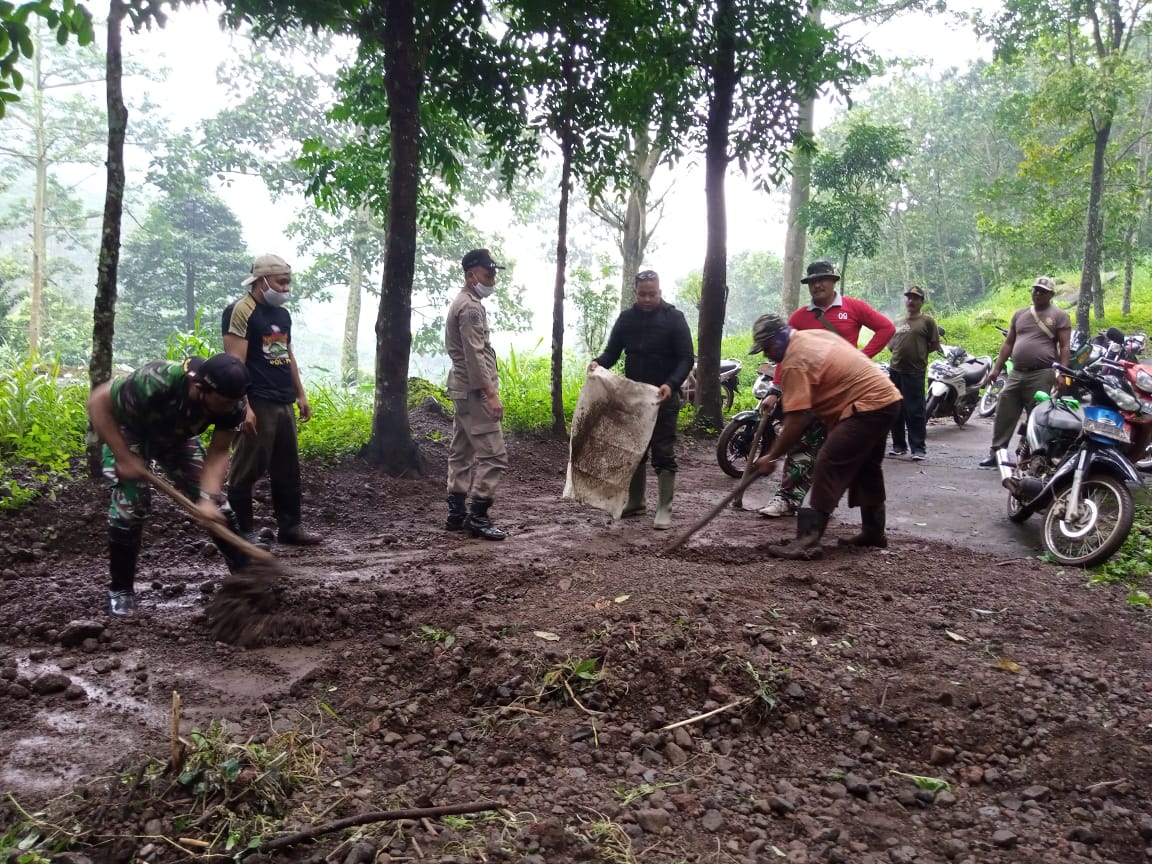 PENJURU.ID | Probolinggo – Anggota Koramil 0820/09 Lumbang, bersama anggota BPBD, Babinkamtibmas, Pol PP dan masyarakat melaksanakan karya bhakti membuka jalan menuju wisata air terjun Madakaripura yang diakibatkan tanah longsor di Desa Negororejo, Kecamatan Lumbang, Kabupaten Probolinggo. selasa, (16-3-2021).