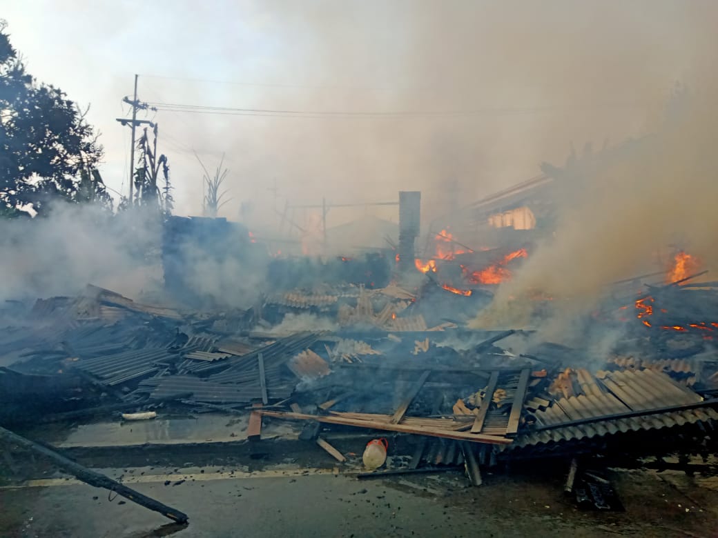 Kuatnya tiupan angin ditambah cuaca panas membuat api Dengan cepat melalap bangunan semi permanen dengan ribuan lembar triplek.
