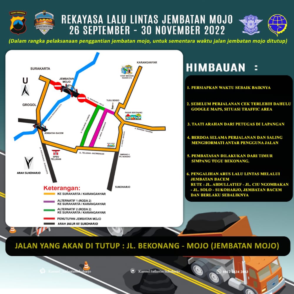 AKBP Wahyu menambahkan, pihaknya juga sudah menyosialisasikan perihal rekayasa lalu lintas terkait imbas penutupan akses vital Jembatan Jembatan Mojo. Hal tersebut masih diikuti dengan pemasangan papan sosialiasi berupa rambu-rambu penunjuk arah tambahan disimpang jalur strategis, seperti di Simpang 3 Bekonang, Simpang 3 Tugu Bendo, Simpang 3 Tegalmade, Timur Polsek Mojolaban, Simpang 3 Ngombakan arah Jl. Ciu, Pertigaan Pasar Nongko, Simpang 4 Jl. Ciu Telukan, dan median jalan depan SFA Steak.