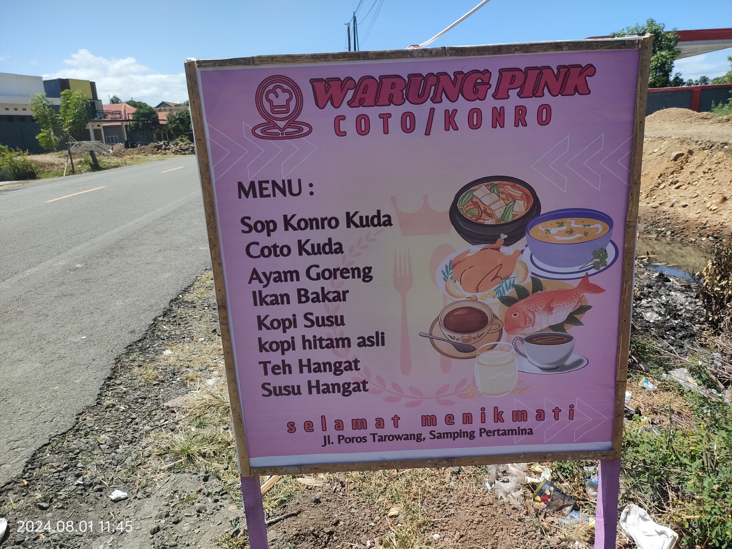 Diberi nama “Warung Pink Coto/Konro”. Daeng Kanang juga menyajikan menu lain seperti SOP Coto Kuda, Ayam Goreng dan berupa minuman, Kopi Susu, Kopi Hitam Asli, Teh Hangat dan Susu Hangat. (*)