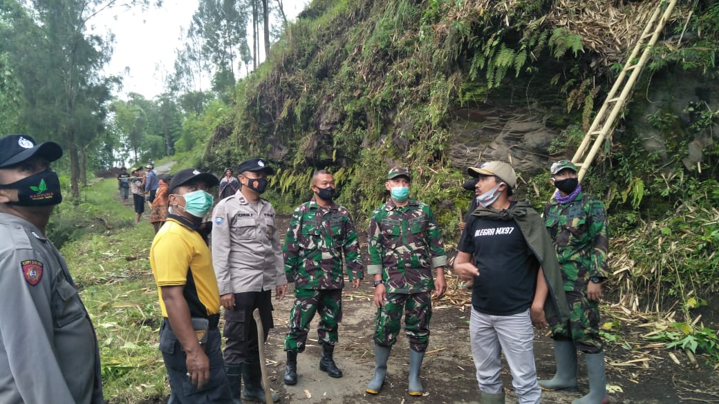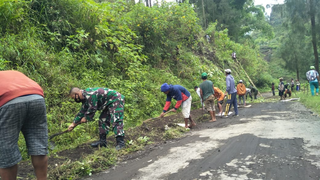 PENJURU.ID | Probolinggo – Mengingat bahaya longsor di musim pehujan tahun ini, pemerintah Desa Wonokerto, Kecamatan Sukapura, Kabupaten Probolinggo, bersama Koramil dan Polsek Sukapura, membersihkan sepanjang jalan yang ada di Desa Wonokerto. Selasa (30/03/2021)