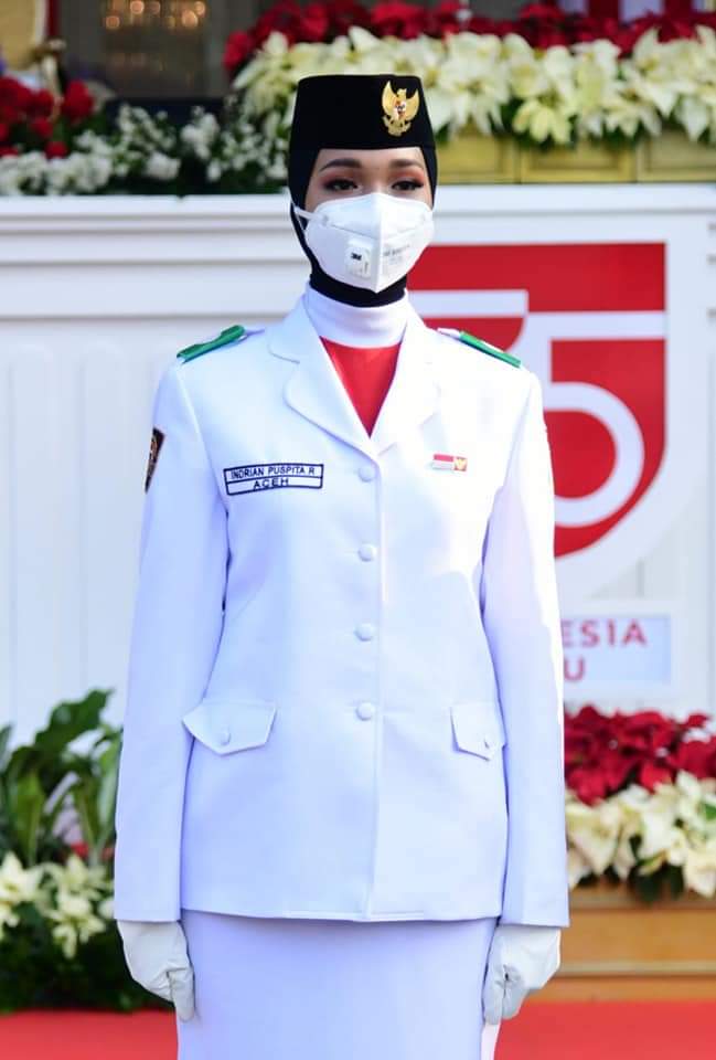 Indrian Puspita Rahmadhani dari Provinsi Aceh terpilih sebagai pembawa bendera Merah Putih. Lahir di Bireuen, 10 November 2003, Indrian saat ini menempuh pendidikan di SMAN 1 Bireuen.