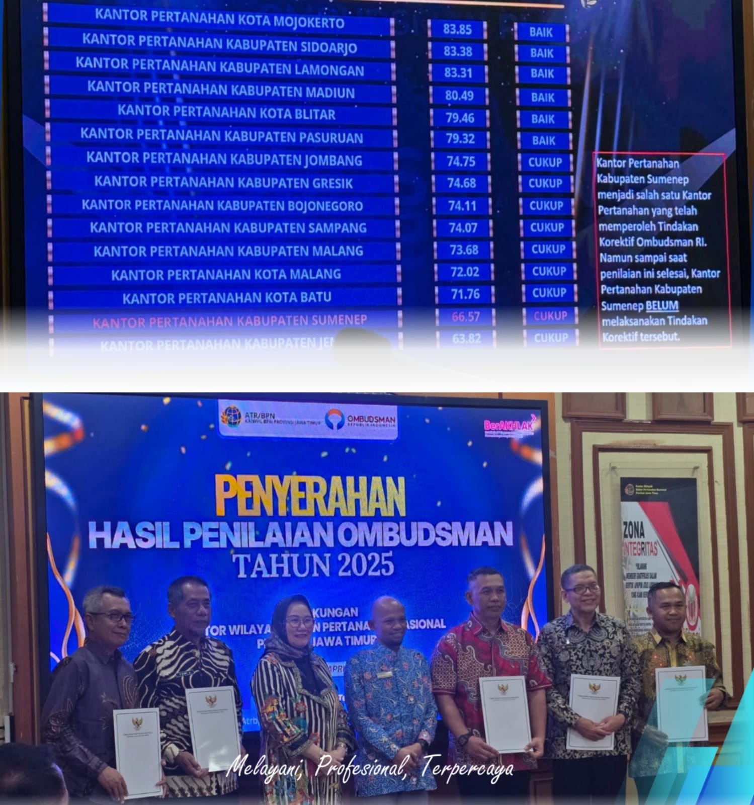 PENJURU.ID | Pasuruan – Kantor Pertanahan Kabupaten Pasuruan berhasil meraih “predikat baik” tahun 2025 dalam penilaian kualitas pelayanan publik dari Ombudsman Republik Indonesia. Penghargaan diterima langsung oleh Kepala Kantor Pertanahan Kabupaten Pasuruan Drs. Herman Hidayat, M.Si.