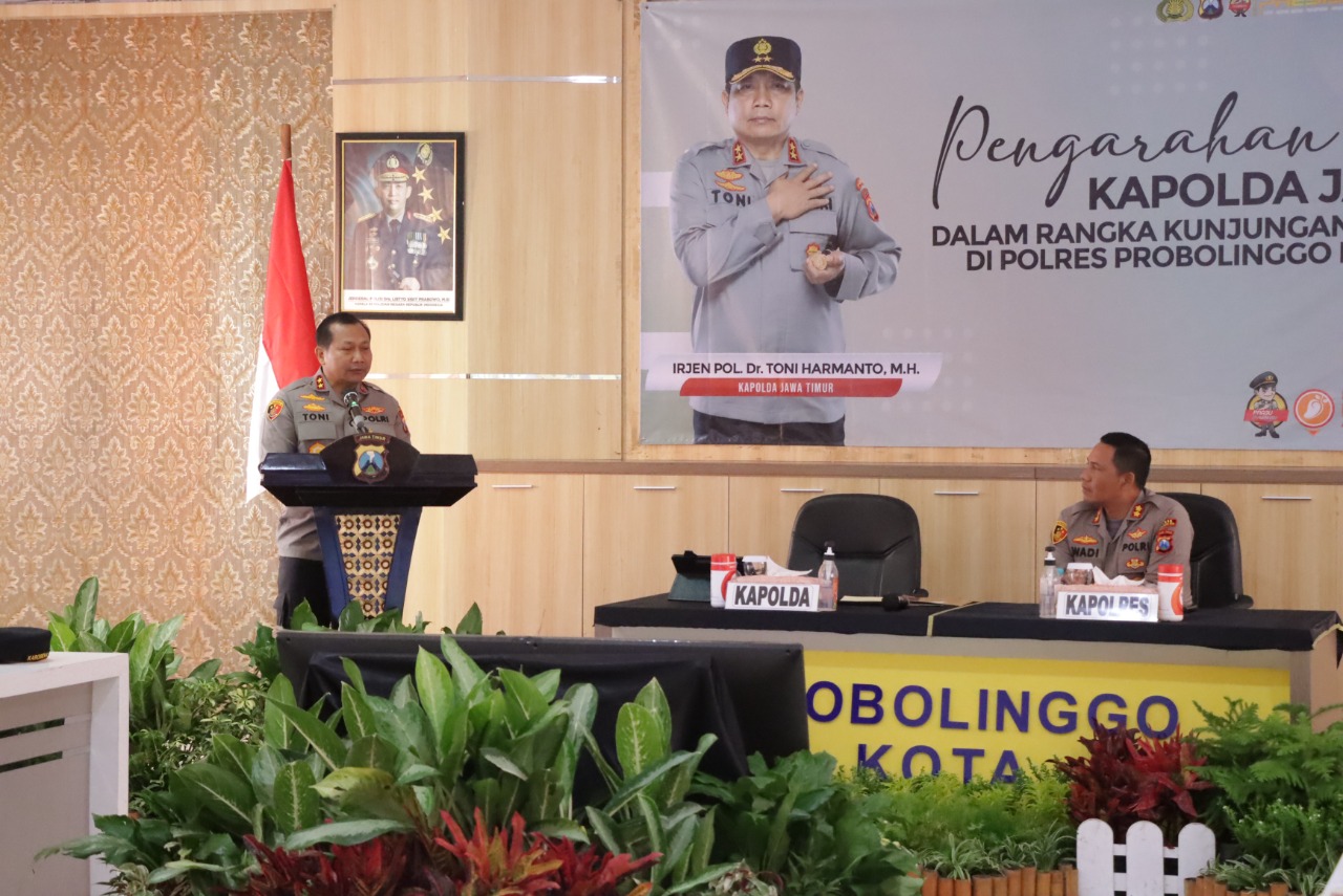 PENJURU.ID | Probolinggo – Usai memberikan bantuan air mineral untuk Masyarakat Pulau Gili Ketapang Probolinggo, Kapolda Jatim Irjen Pol. Dr. Toni Harmanto, S.H. beserta PJU Polda Jatim memberikan arahan kepada anggota Polres Probolinggo Kota di Rupatama Mapolres. Rabu (11/01/2023).