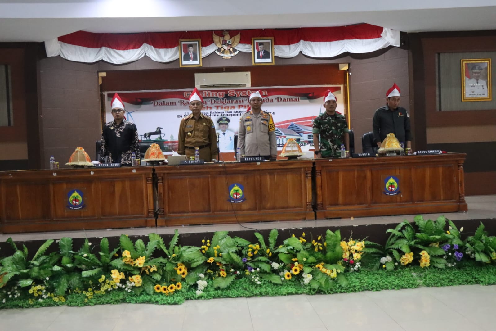PENJURU. ID | Jeneponto – Kapolres Jeneponto AKBP Widi Setiawan, S.I.K., M.I.K., mengajak Pemerintah Kabupaten Jeneponto melaksanakan deklarasi pilkada damai yang melibatkan tiga pilar utama bersama Forum Komunikasi Pimpinan Daerah (Forkopimda) di ruang Pola Panrannuangta Kabupaten Jeneponto.