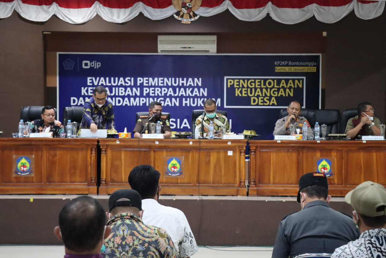 Kegiatan tersebut dengan melaksanakan sosialisasi evaluasi pemenuhan kewajiban perpajakan dan pendampingan hukum pengelolaan keuangan desa bertempat di ruang Pola Panrannuanta Kantor Bupati Jeneponto, Kamis (20/01/2022).